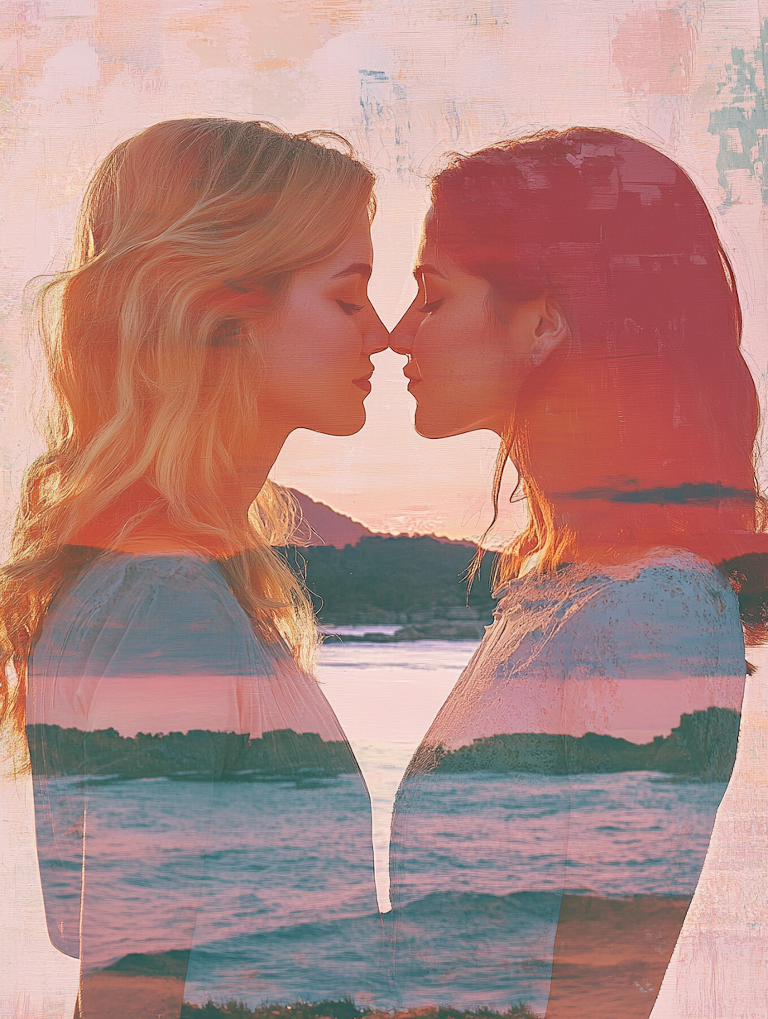 Two women with closed eyes share an intimate moment, artistically blended with a serene landscape of water and shoreline.