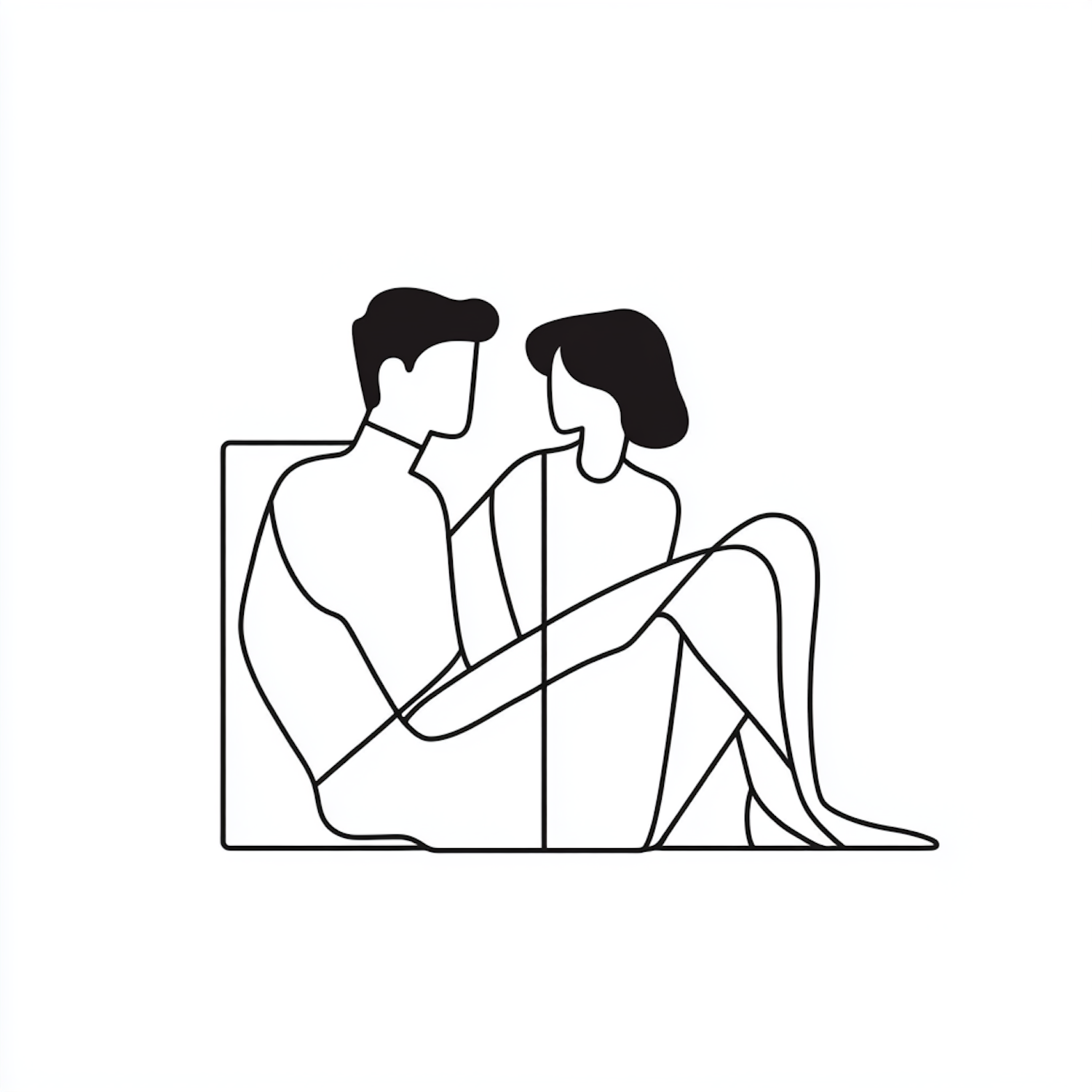 Minimalist line art of two abstract figures sitting closely, symbolizing intimacy and connection with simple black outlines.