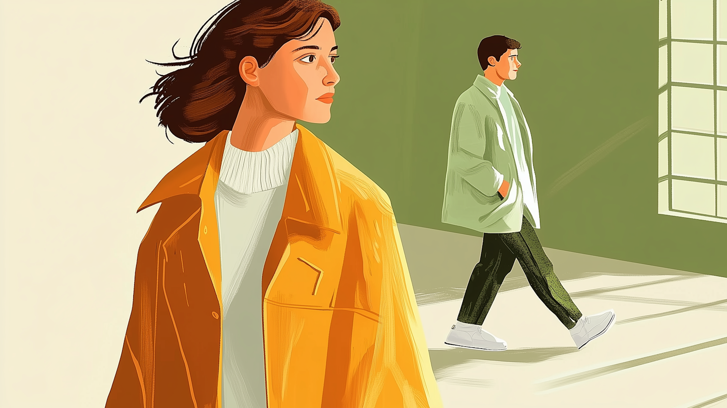 Stylized illustration of a woman in a yellow coat and a man in a green coat in a minimalist setting with soft lighting.