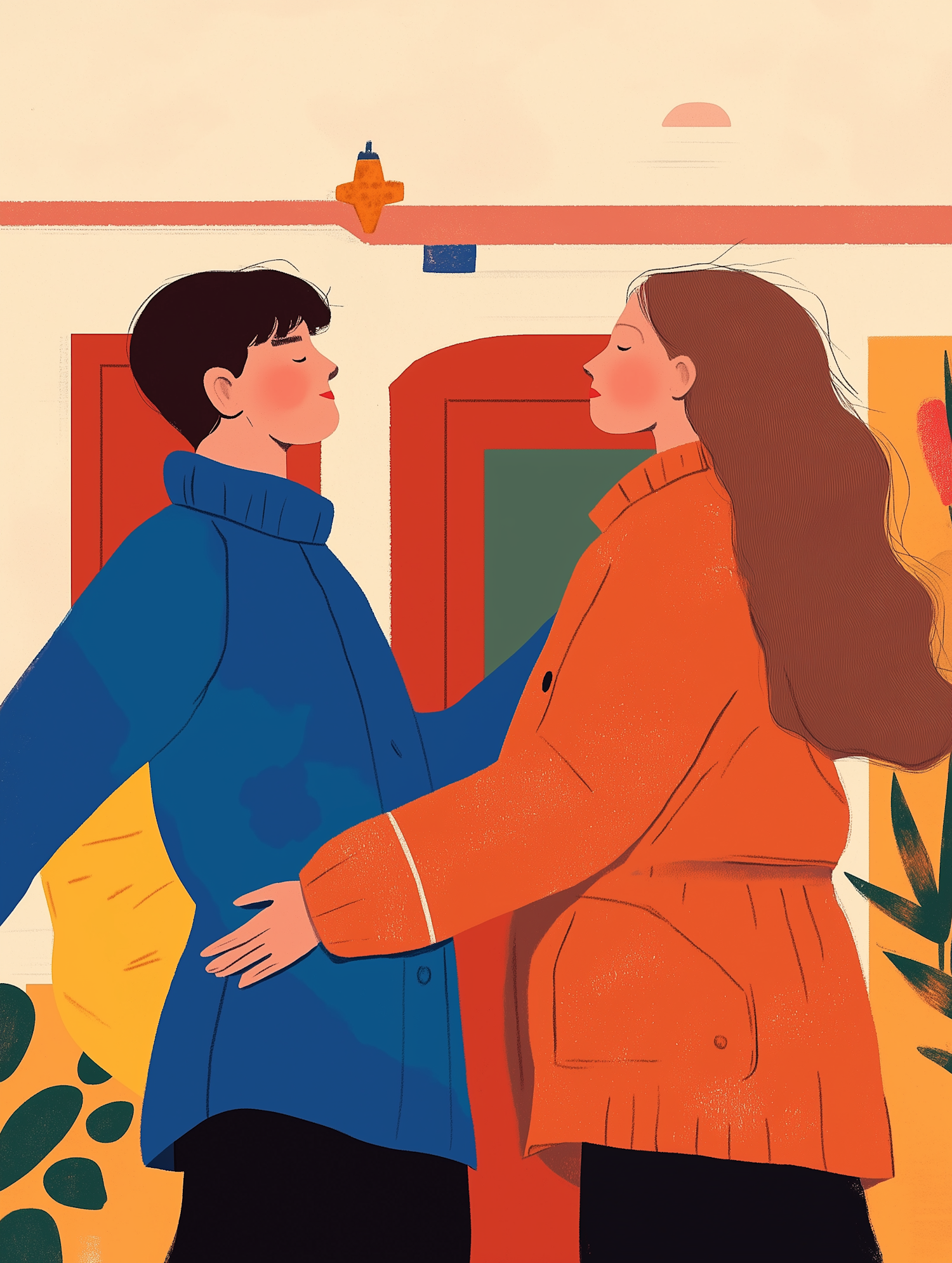 Two people in colorful coats share a moment of connection, surrounded by abstract shapes and warm colors in an artistic illustration.