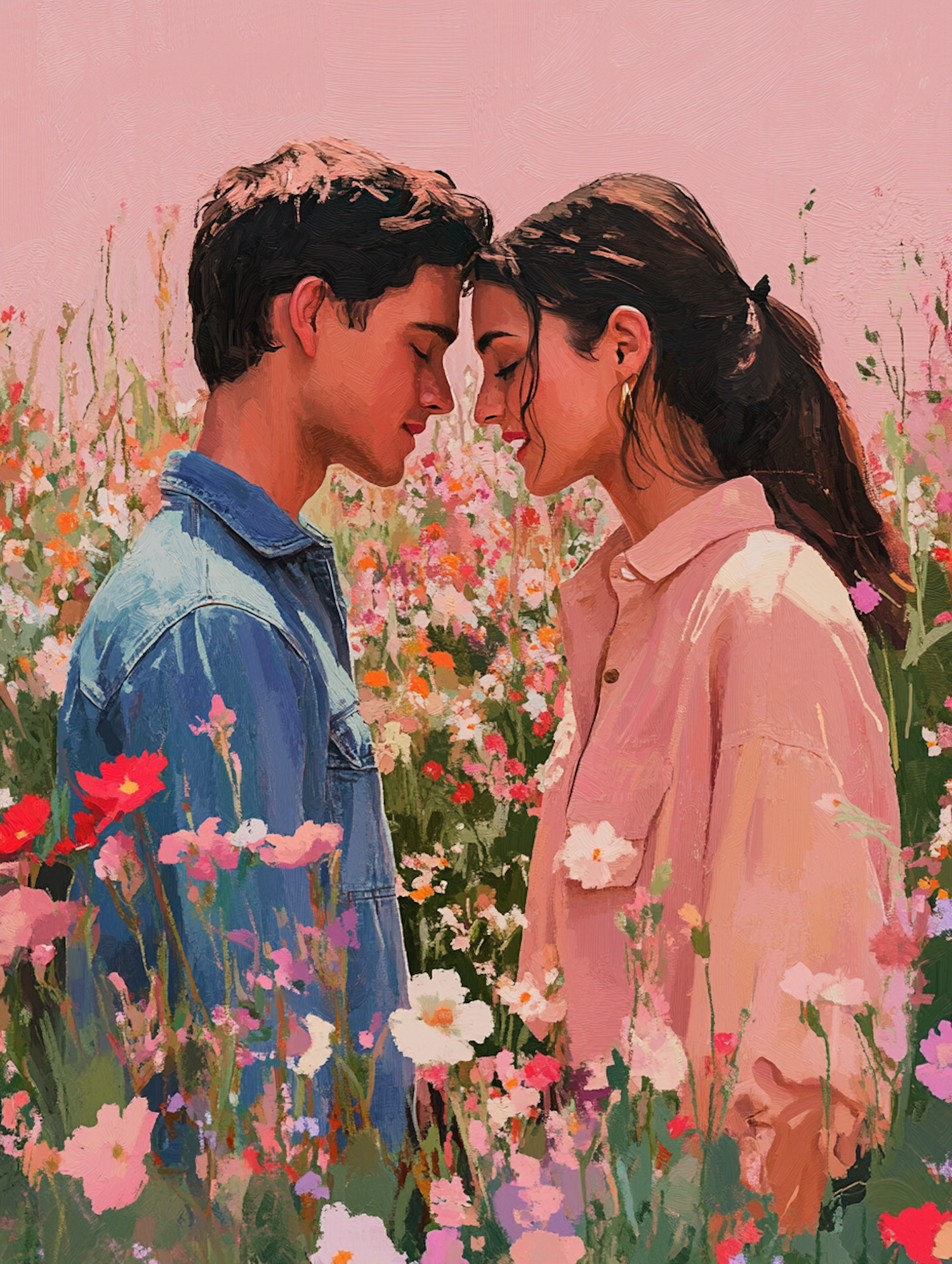 A young couple shares a tender moment in a colorful field of wildflowers, surrounded by pink, red, and white blooms under a soft pink sky.