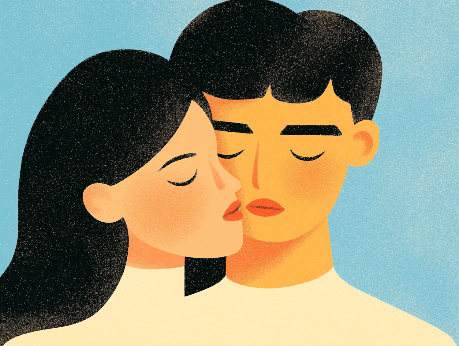 Stylized illustration of a serene couple with closed eyes, embracing against a soft blue background.