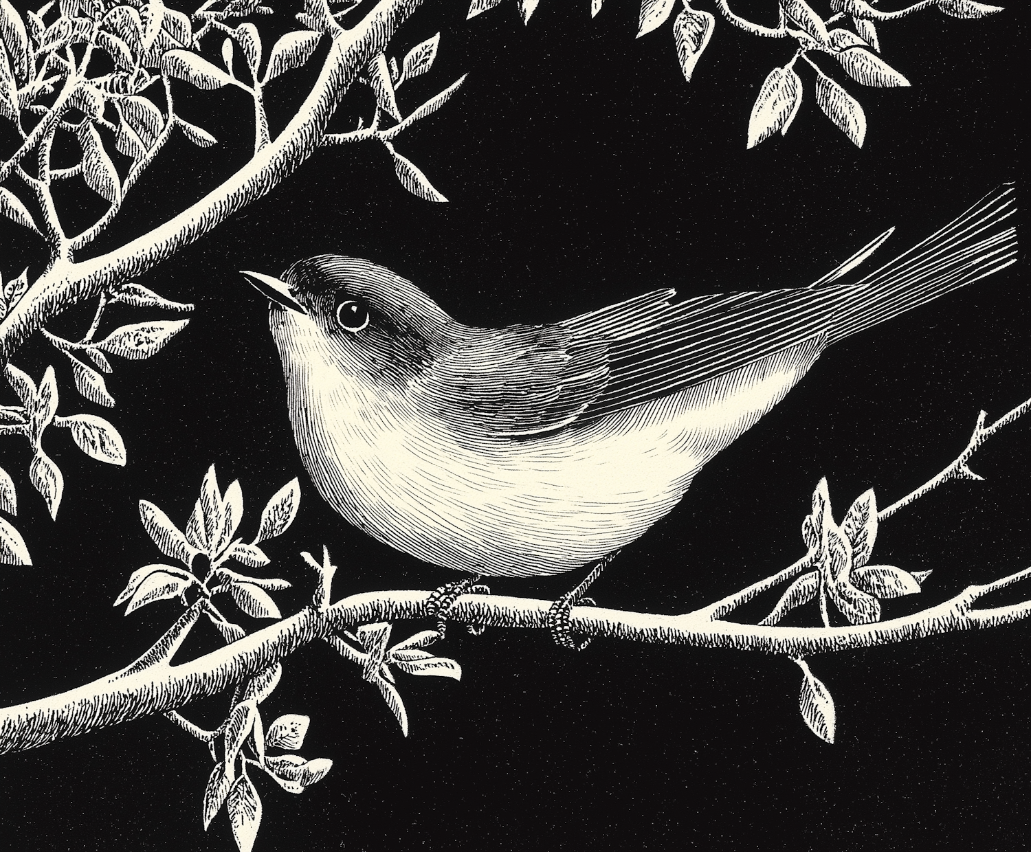 Intricate black and white illustration of a bird on a branch, with detailed line work and a striking contrast against a dark background.