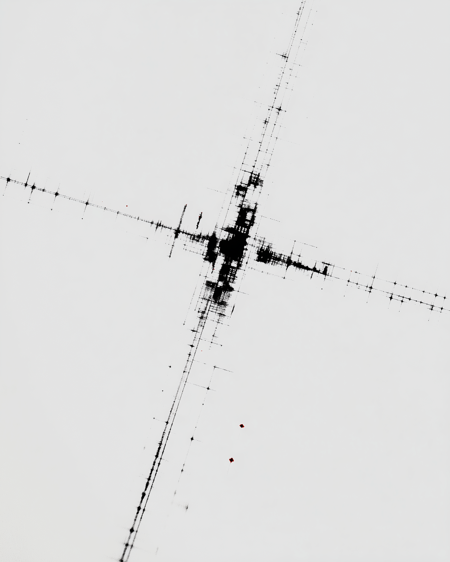 Minimalistic abstract art featuring detailed intersections of black and white lines with occasional red highlights on a clean background.