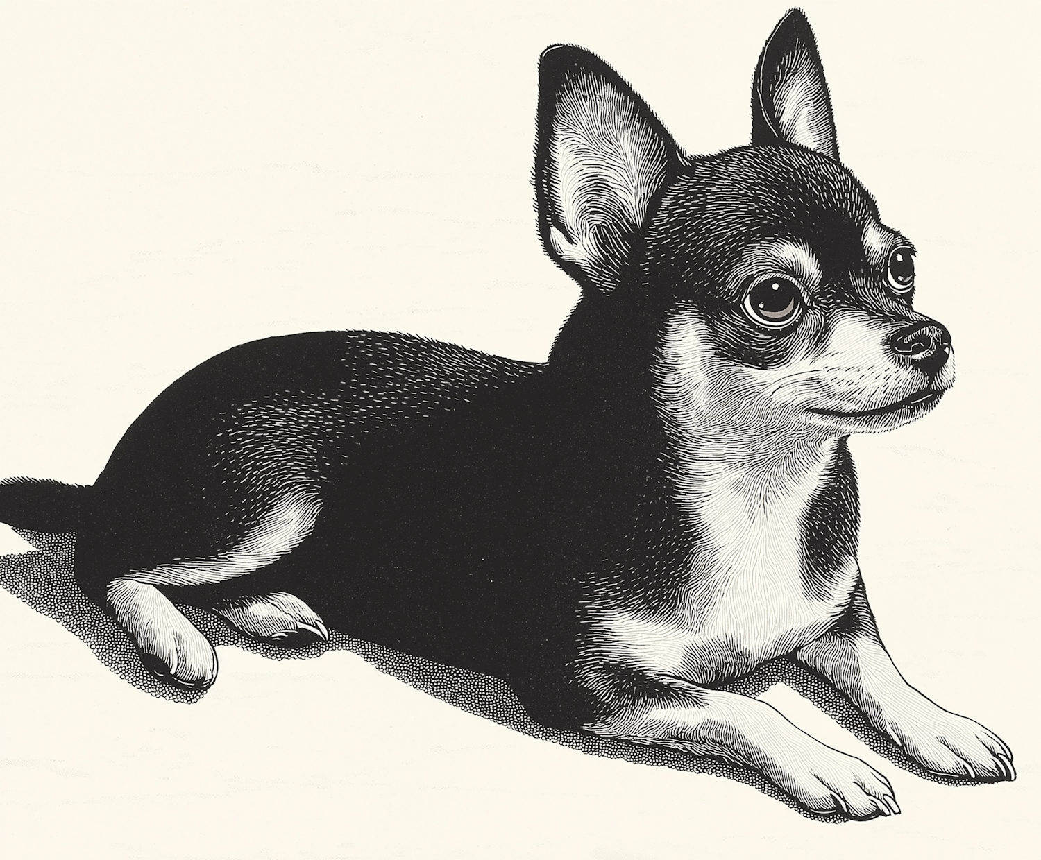 Detailed black and white illustration of a Chihuahua with expressive eyes and textured fur, lying down with upright ears.