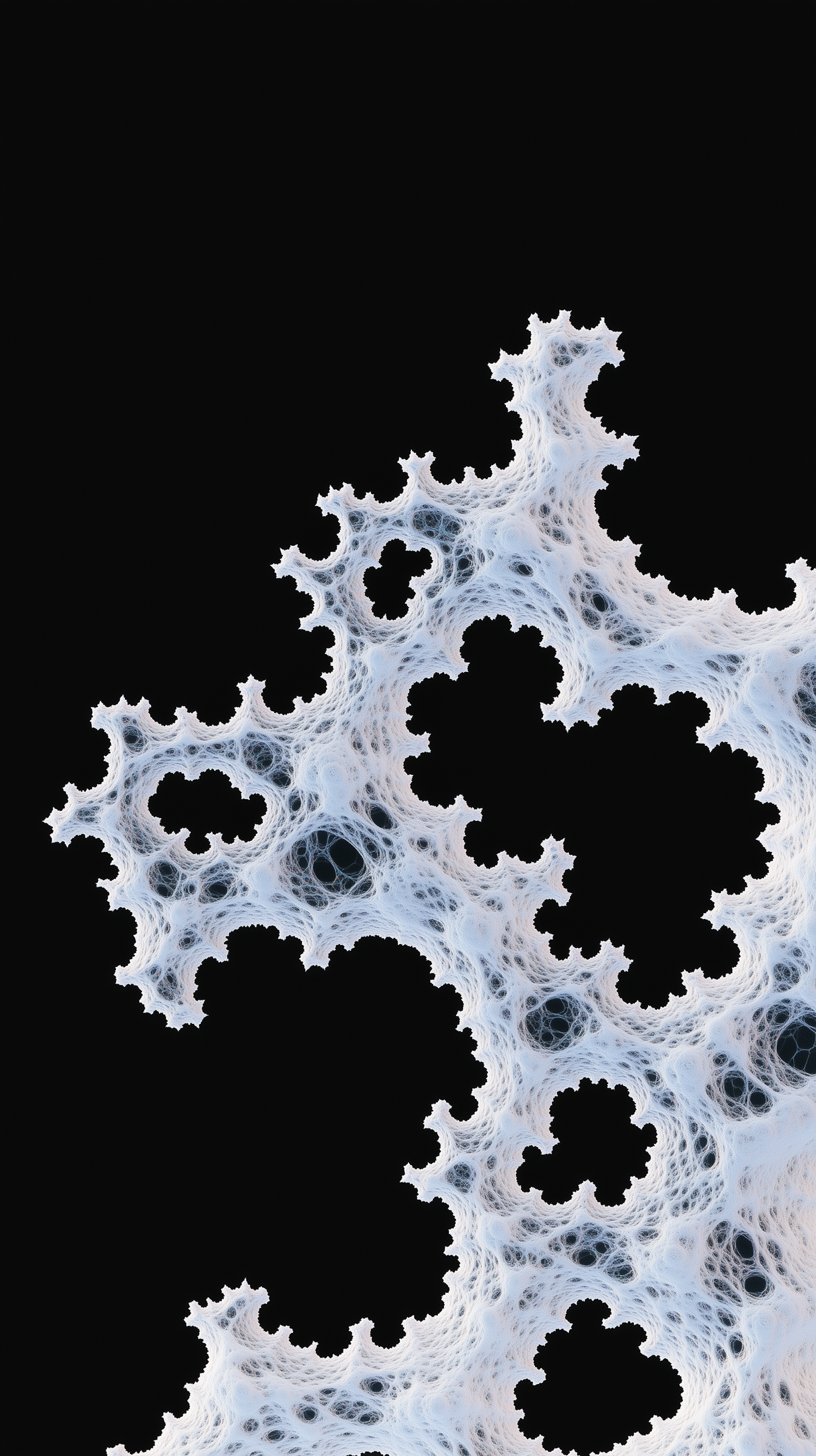 Intricate white fractal pattern on a black background, resembling delicate lace or coral, with complex, repeating structures.