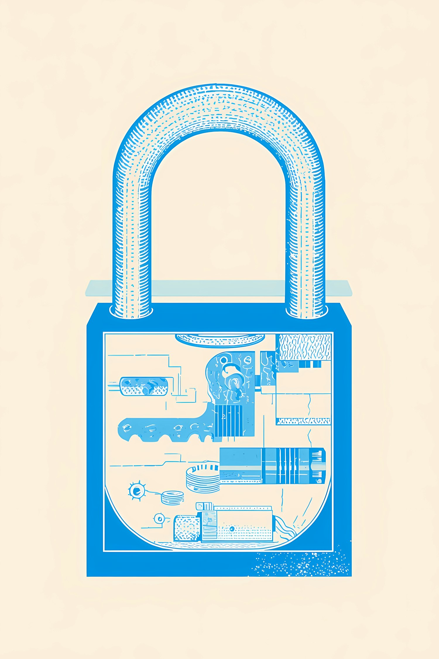 Stylized illustration of a padlock with exposed internal mechanisms, showcasing intricate details in blue on a beige background.