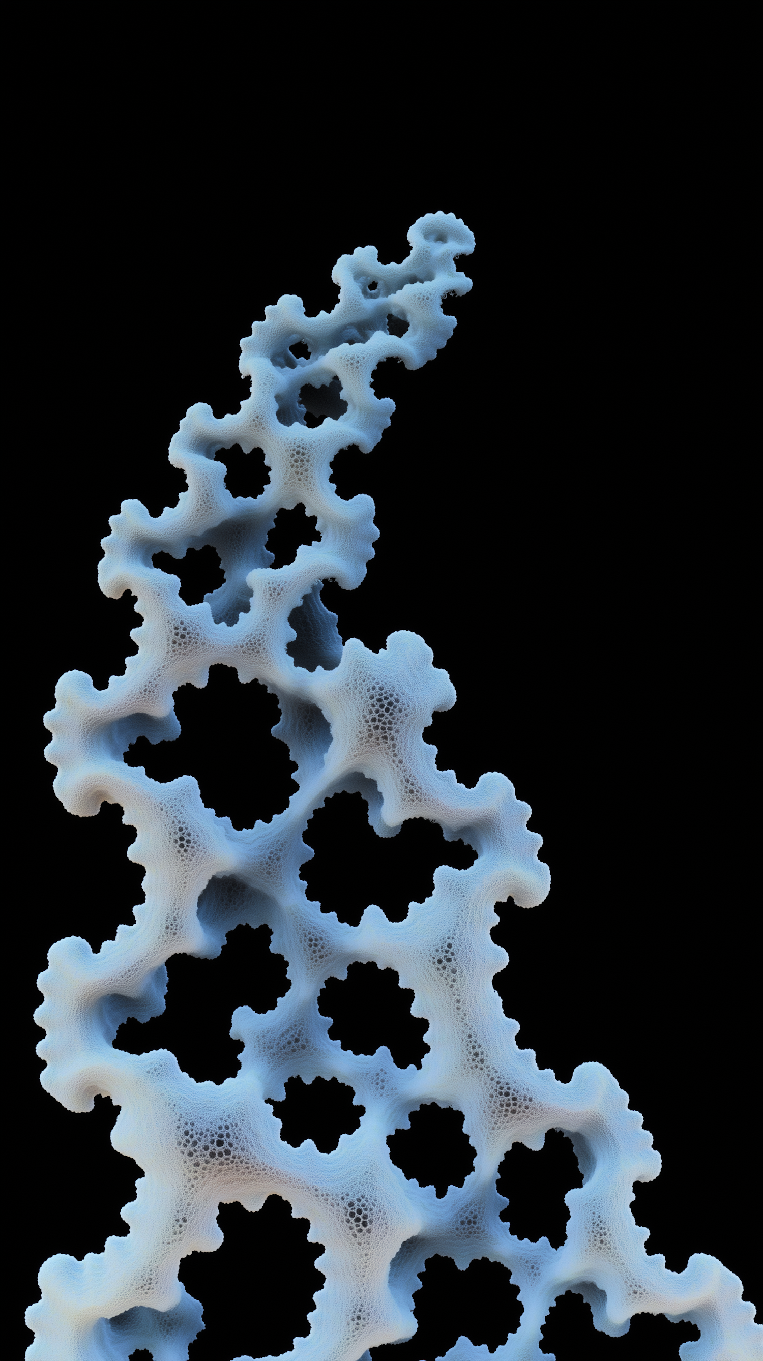Intricate 3D-rendered organic lattice with a pale blue hue, set against a black background, showcasing a fractal-like porous design.