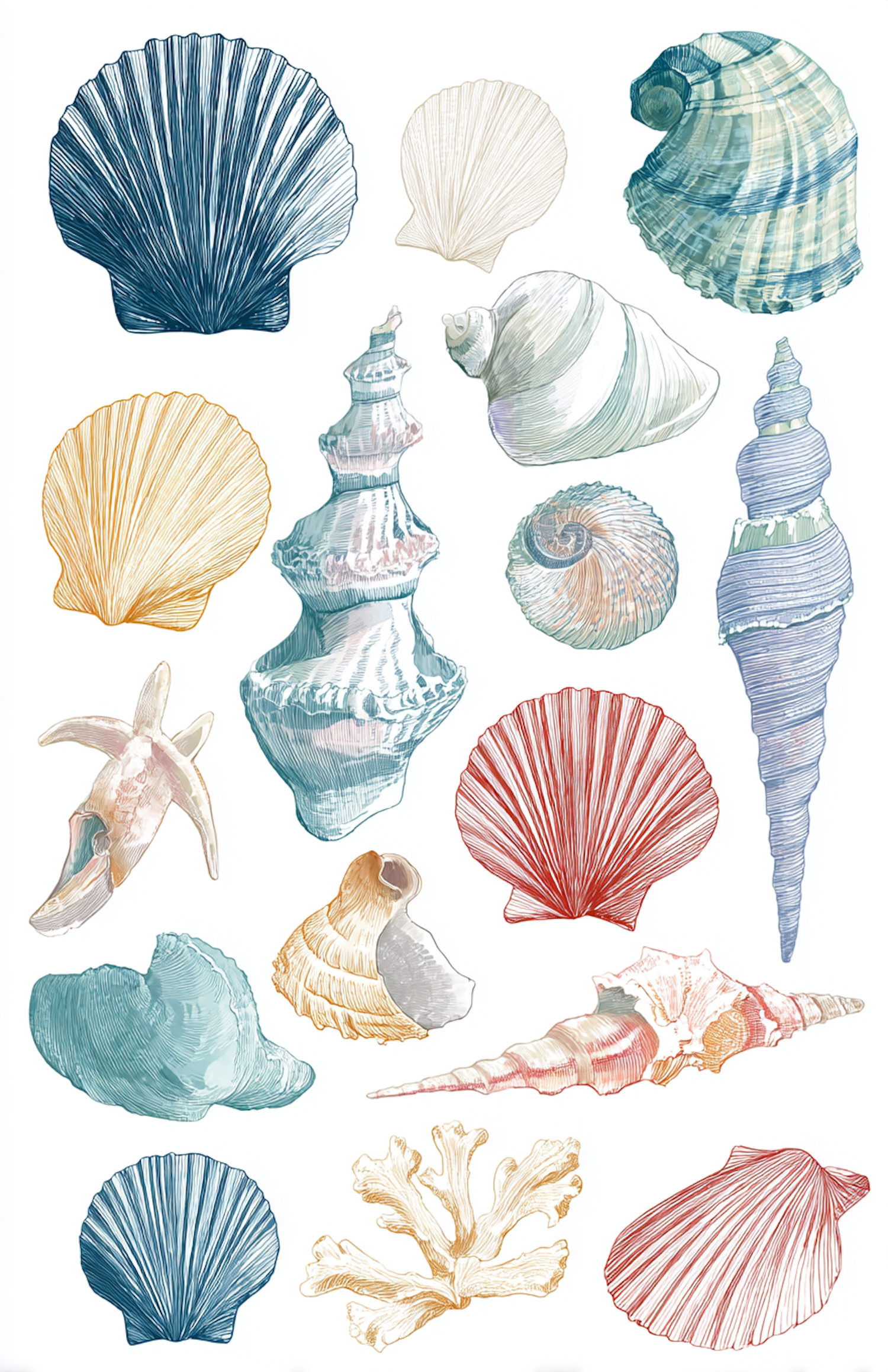 Elegant illustrations of diverse seashells in blue, red, and yellow tones, set on a clean white background, showcasing oceanic beauty.