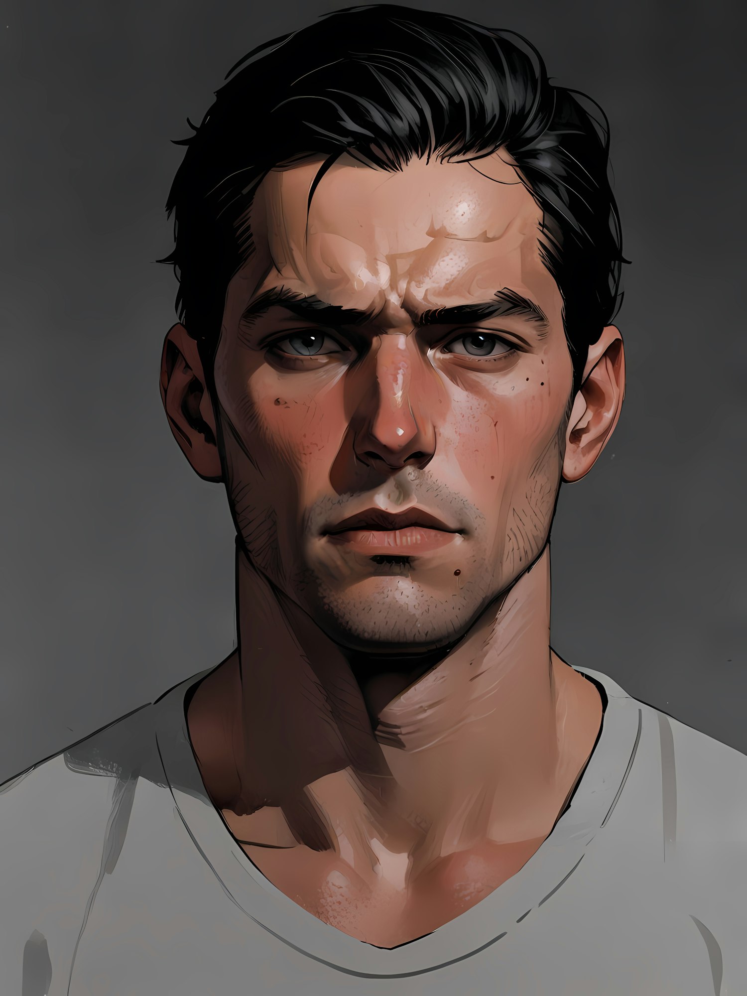 Digital illustration of a serious Caucasian man with dark hair and a light gray shirt against a muted gray background.