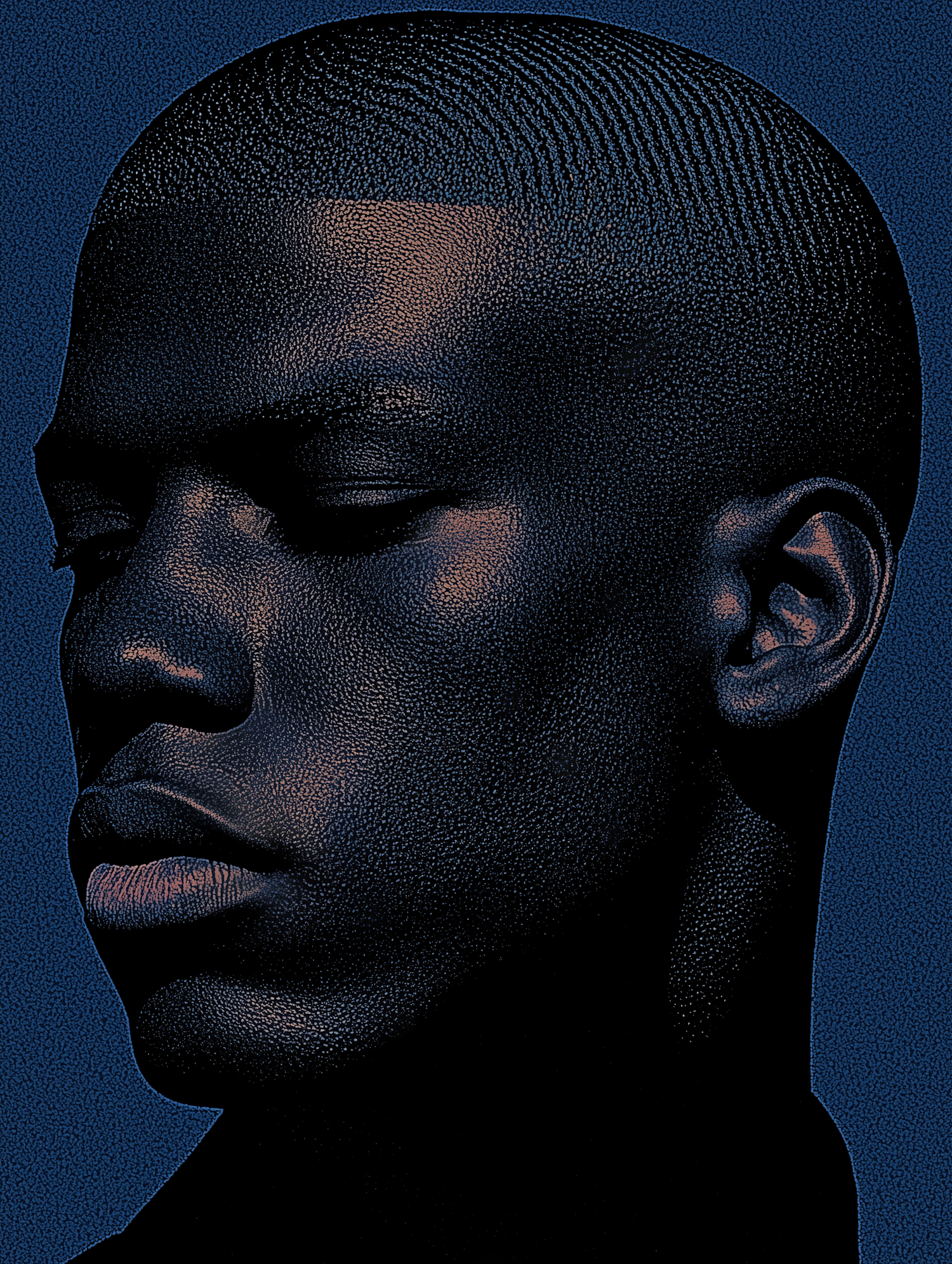Stylized illustration of a Black man with a textured, stippled effect, set against a deep blue background. Dramatic lighting and shadows.