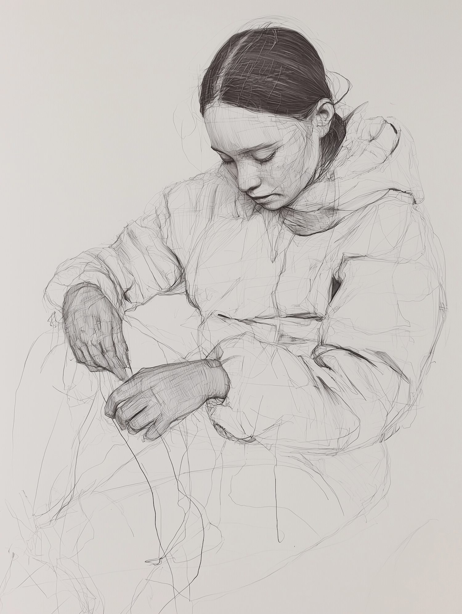 Intricate pencil sketch of a young woman in a contemplative pose, focusing on her hands. Detailed lines capture her serene expression.