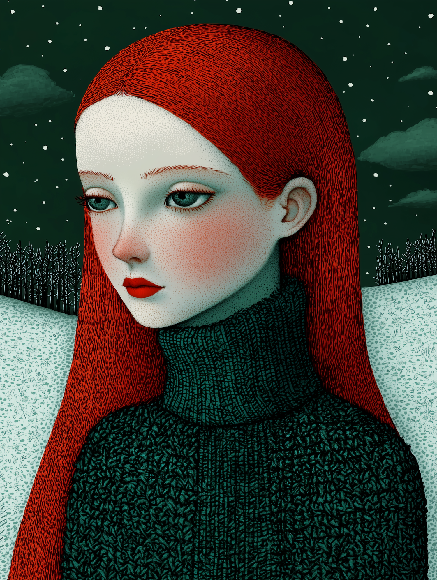 Illustration of a person with vibrant red hair and a green sweater against a starry night sky, featuring a snowy landscape.