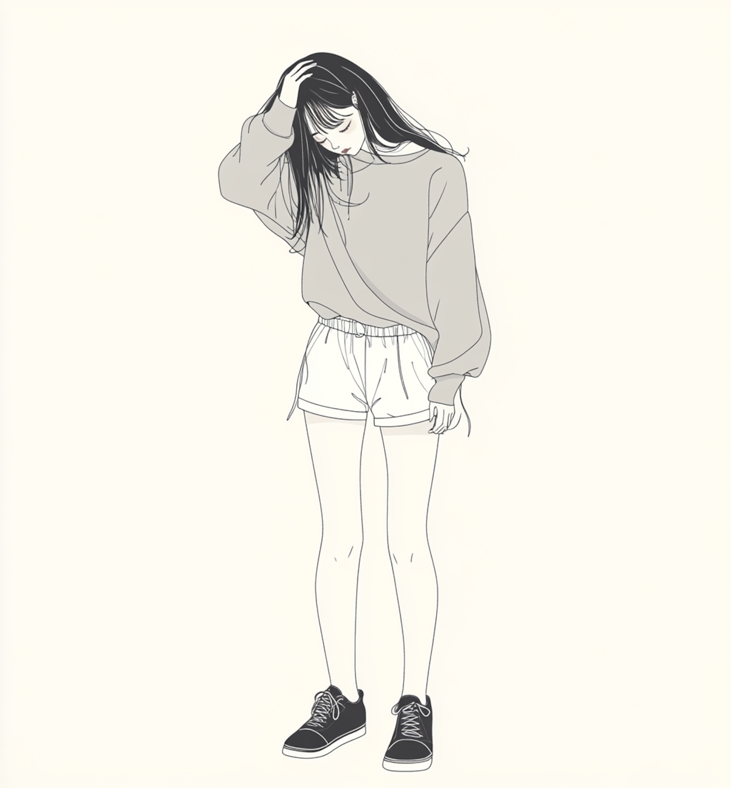 Minimalist illustration of a young woman in casual attire, featuring a loose sweater, shorts, and sneakers, with a calm expression.