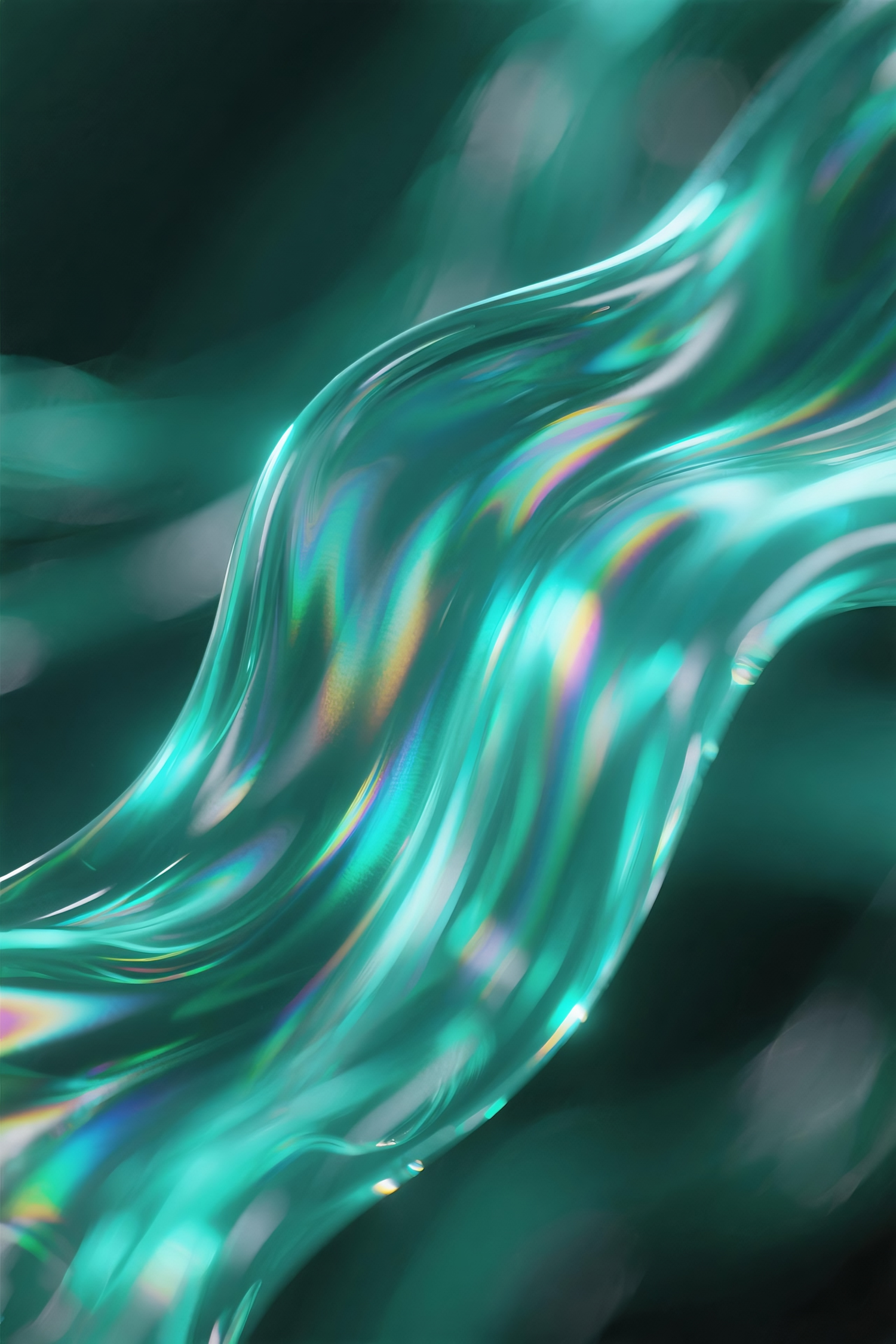 A vibrant, flowing, iridescent material in teal and green hues, with a glossy surface reflecting light in a dynamic, abstract composition.