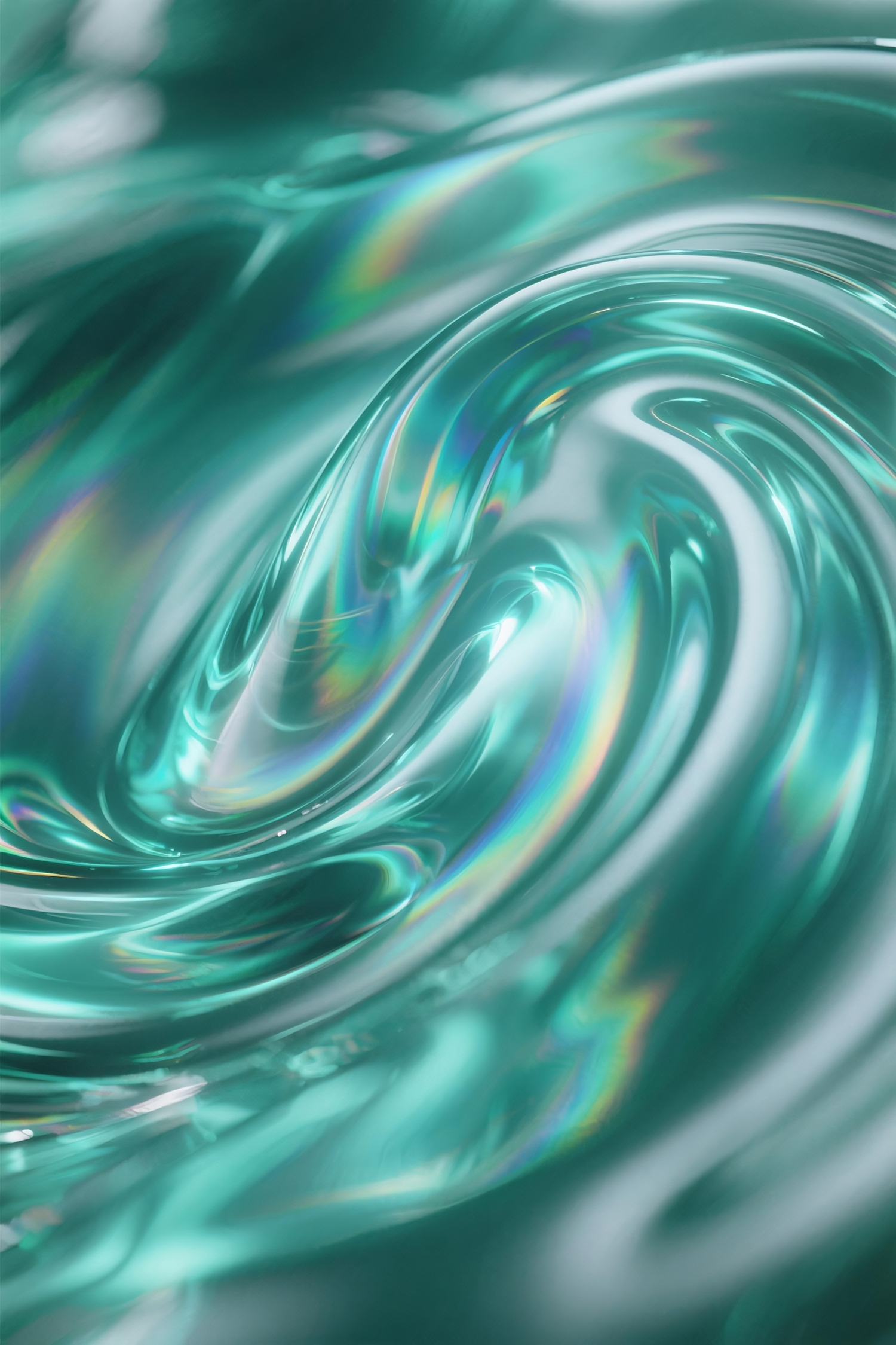 Abstract teal and iridescent swirls with a glossy, fluid texture, creating a dynamic and vibrant visual effect.