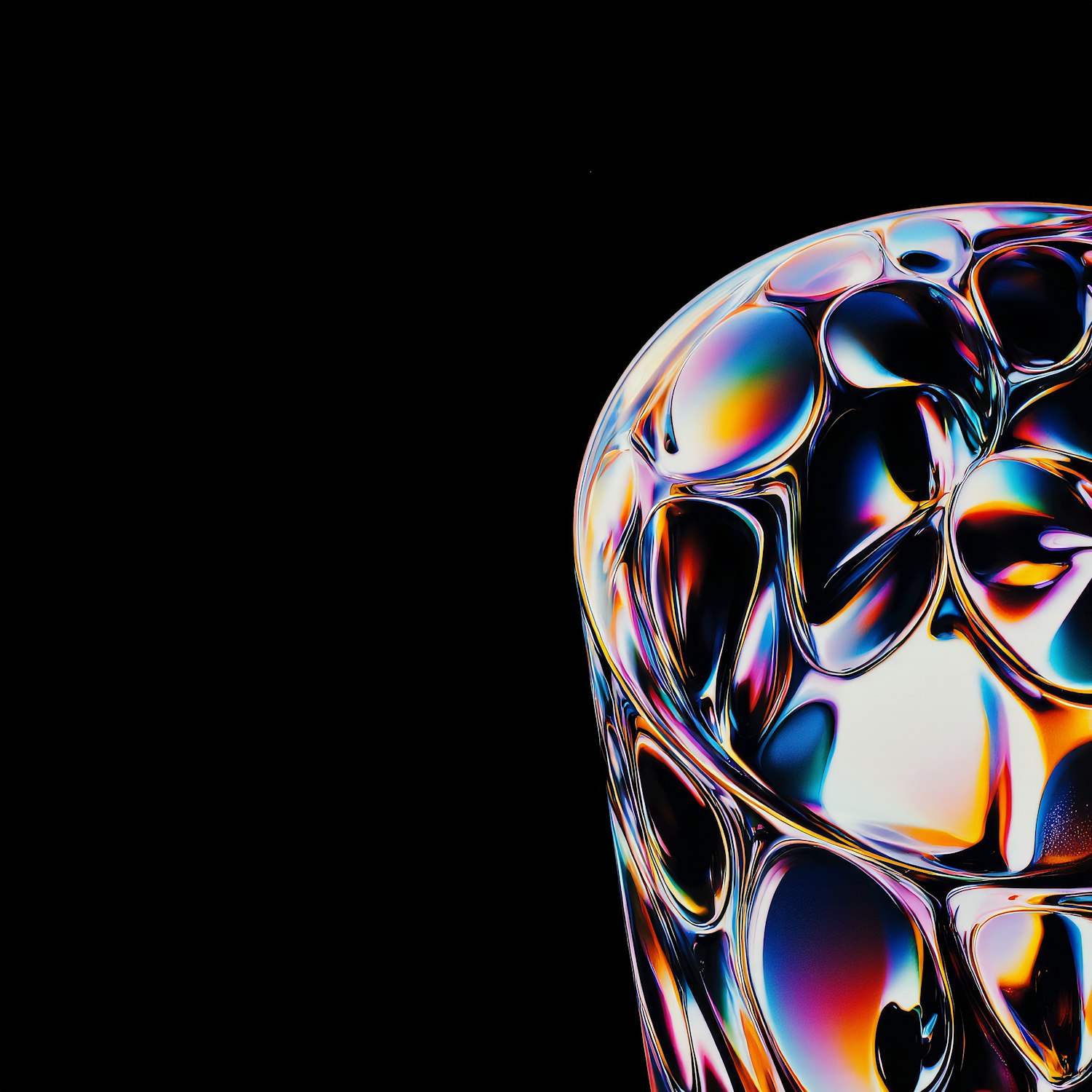 A vibrant close-up of a glass object with iridescent reflections, showcasing a spectrum of colors on a black background.