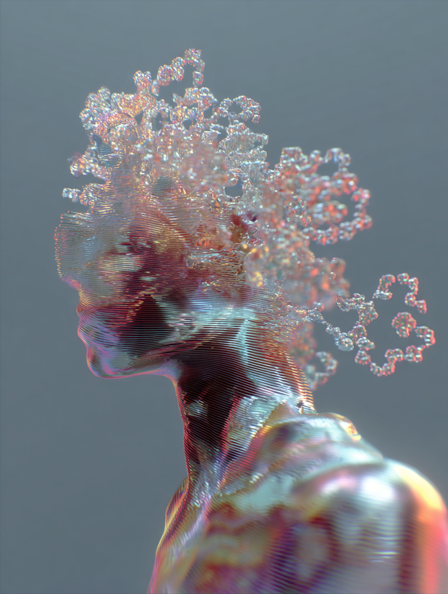 A stunning digital artwork of a humanoid figure with iridescent textures and fractal-like structures, set against a neutral background.
