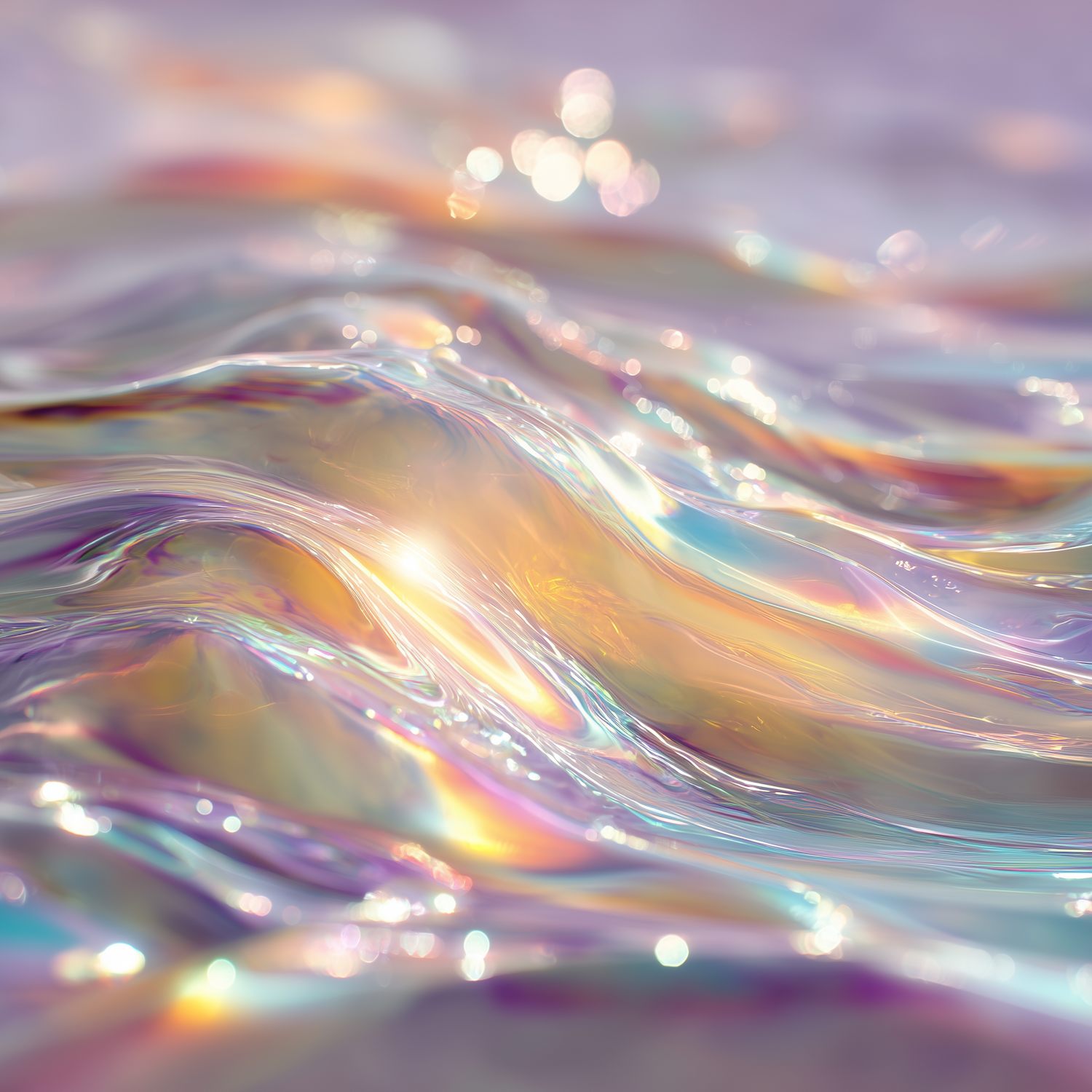 A mesmerizing close-up of iridescent liquid waves reflecting pastel colors and light sparkles, creating a dreamy and ethereal effect.