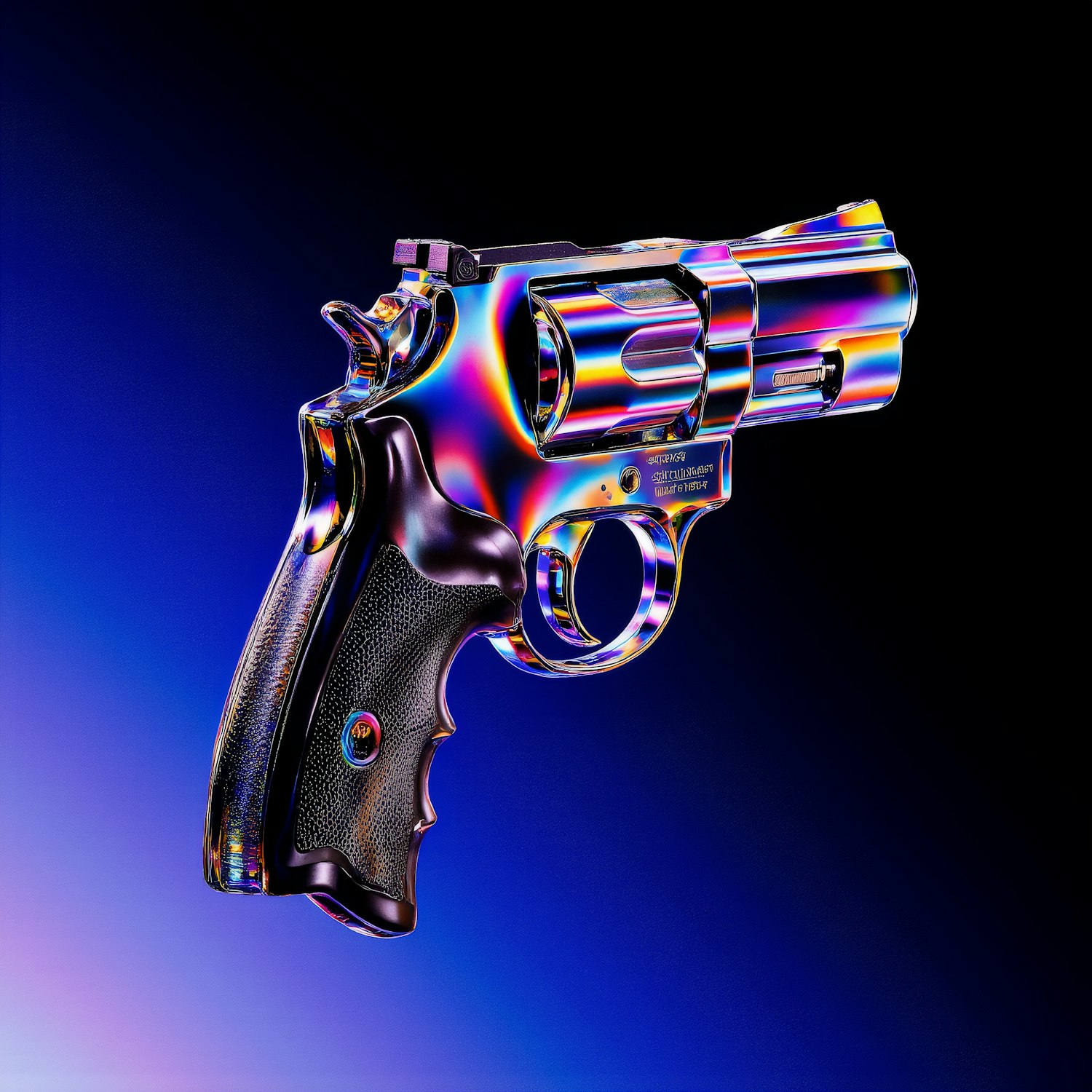 A revolver with a vibrant, iridescent finish against a gradient blue and purple background, showcasing its reflective and textured details.