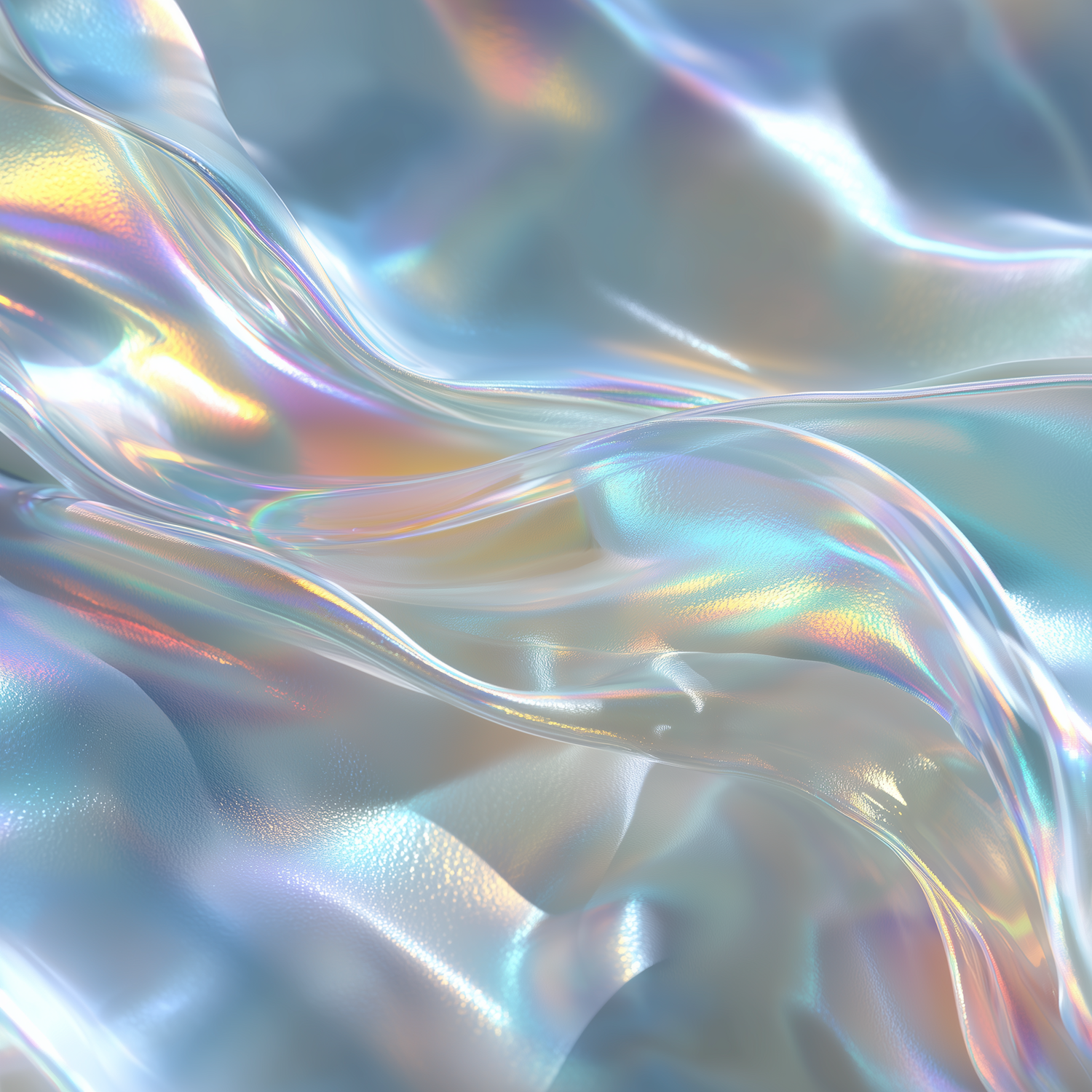 A mesmerizing close-up of a pearlescent, iridescent surface with flowing, wavy textures and a dreamy spectrum of colors.