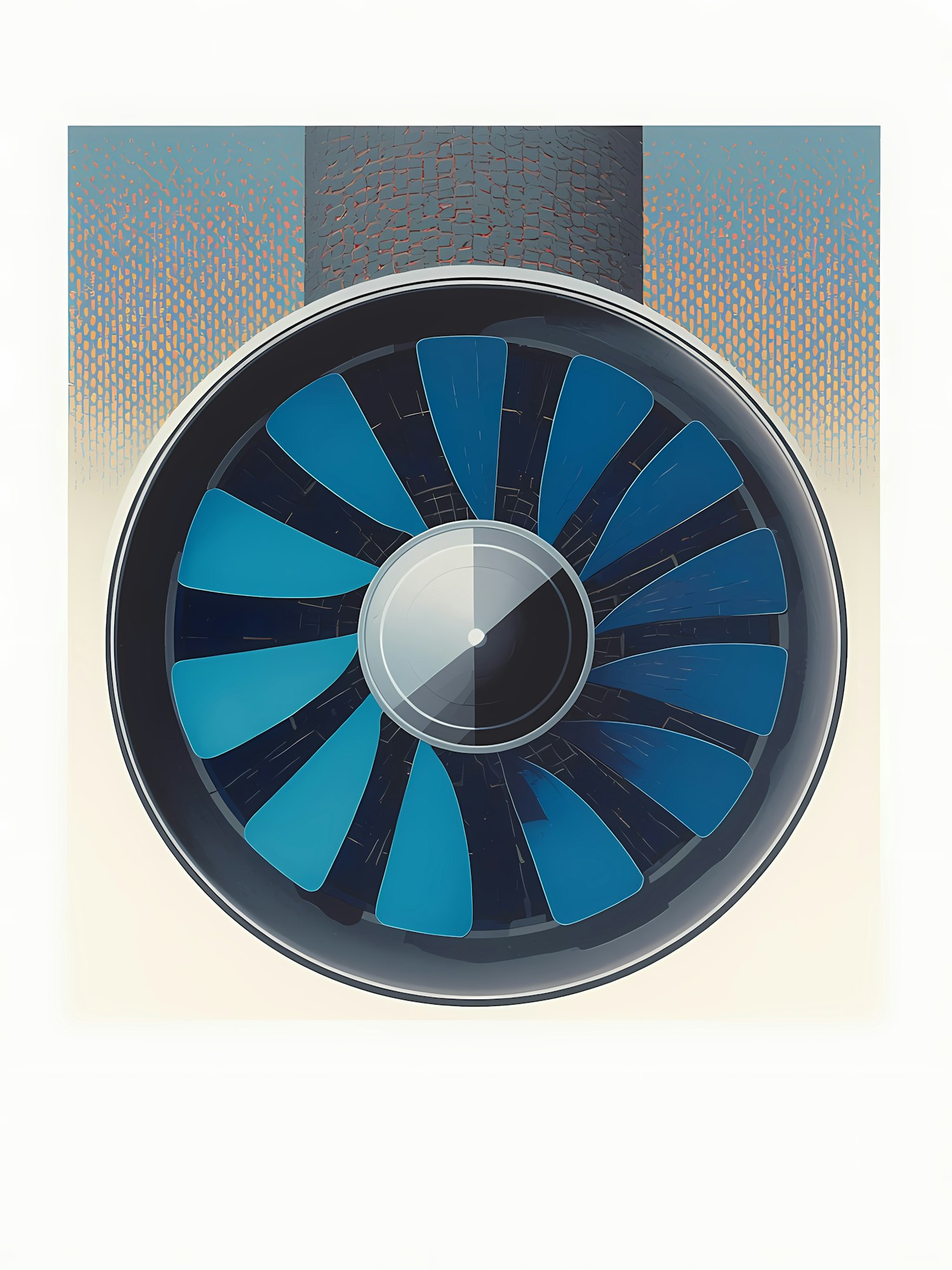 Stylized illustration of a jet engine turbine with blue blades and a textured gradient background, showcasing mechanical precision.