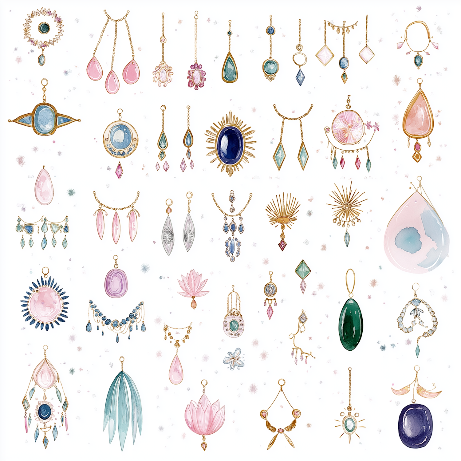 Beautifully illustrated jewelry collection featuring gold accents, gemstones, and celestial motifs in soft pink, blue, and green hues.