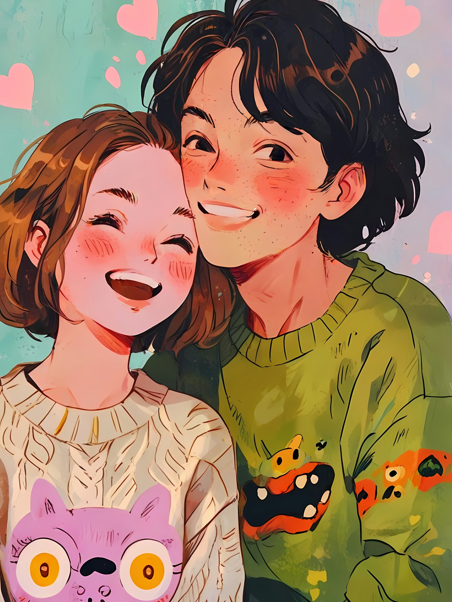Joyful illustration of a smiling boy and girl in colorful sweaters with playful designs, surrounded by pink hearts.