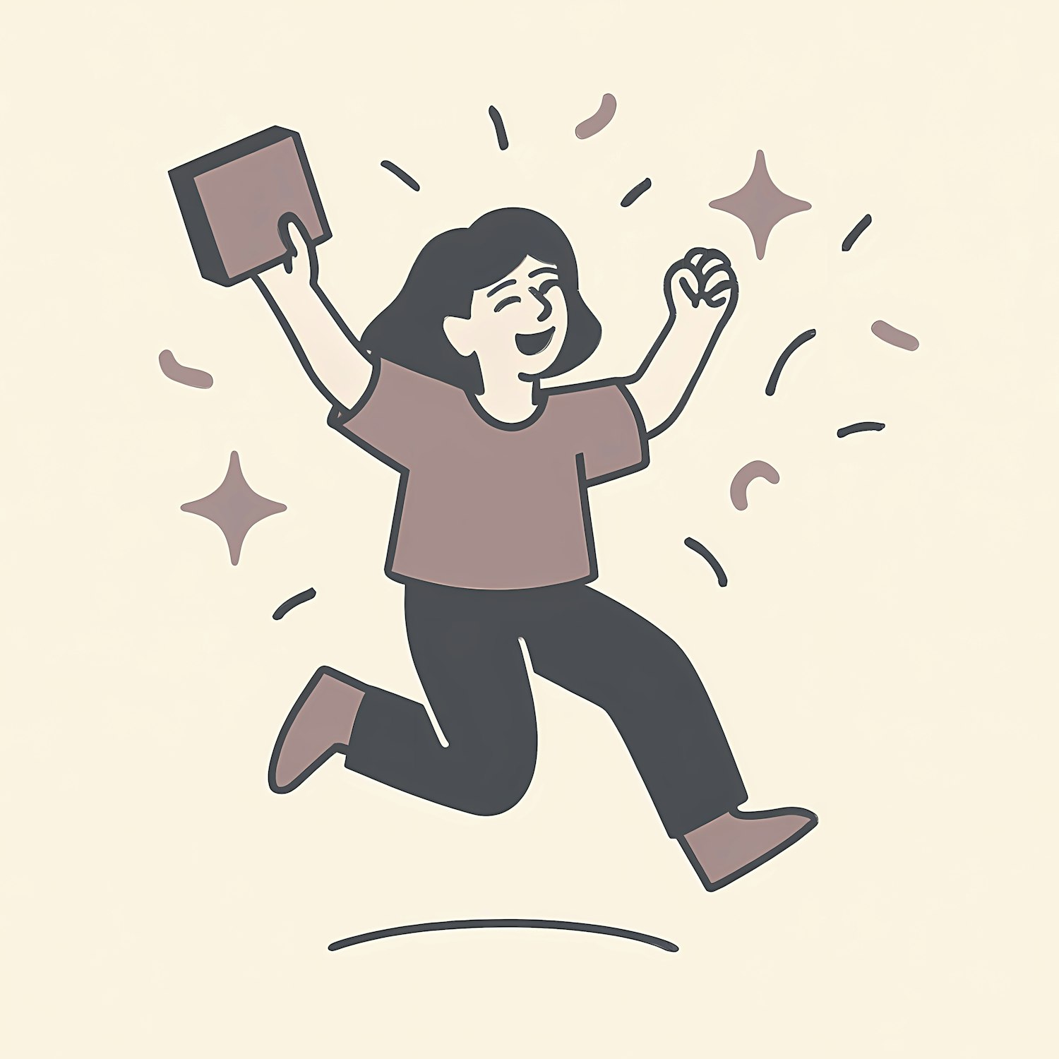 A joyful cartoon character jumping with excitement, holding a book, surrounded by sparkles and confetti in a warm, muted color palette.