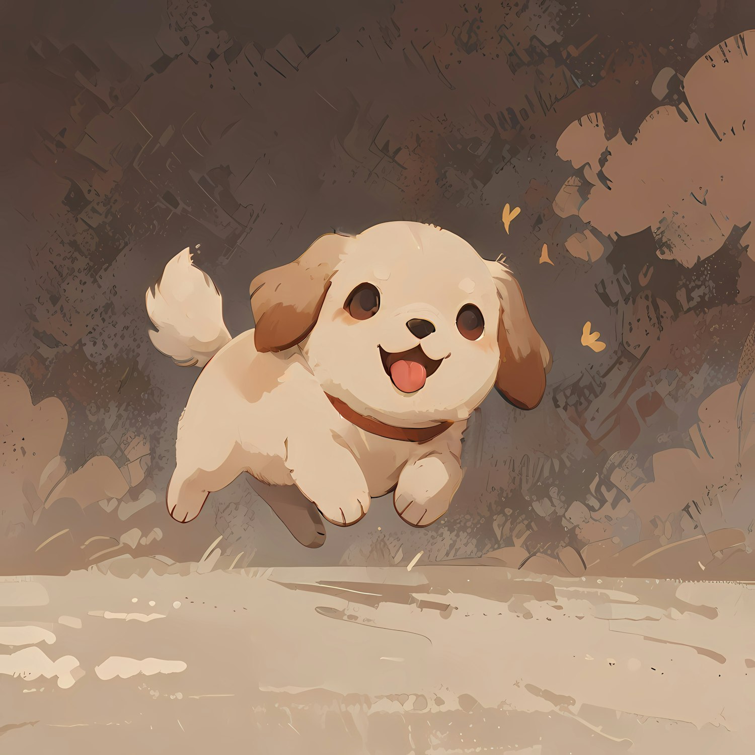 Adorable cartoon dog leaping joyfully with butterflies in a whimsical, earthy-toned background.