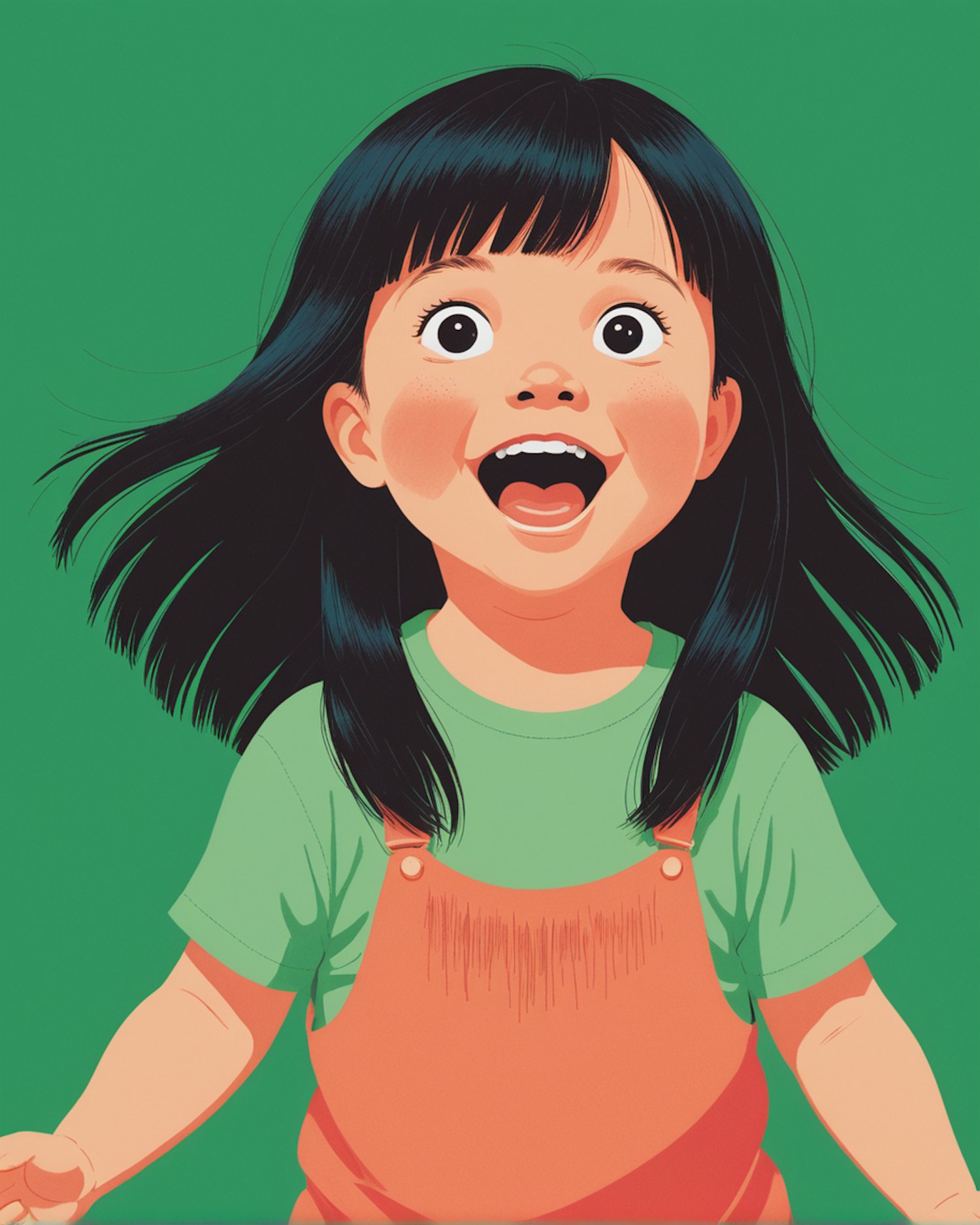 Vibrant illustration of a joyful young girl with black hair, wearing green and orange, against a solid green background.