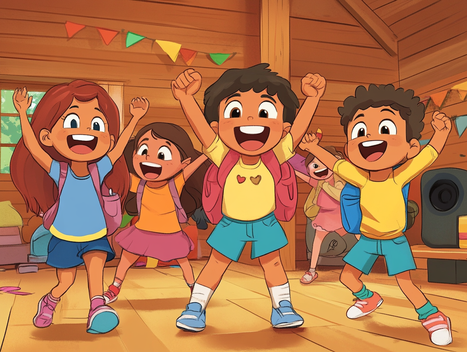 Joyful cartoon children celebrating with raised arms in a colorful room. Diverse group with backpacks, creating a festive atmosphere.