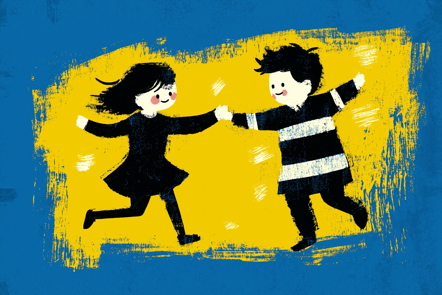 Two cartoon children joyfully dance on a vibrant blue and yellow background, capturing a playful and lively moment.