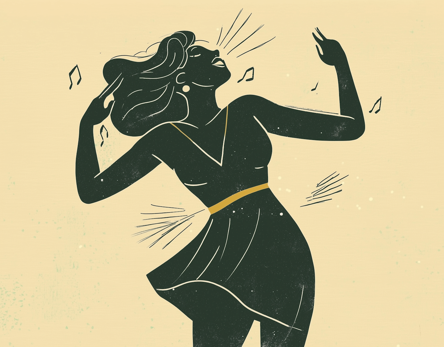 Stylized illustration of a woman dancing joyfully with musical notes, in dark green and beige tones.