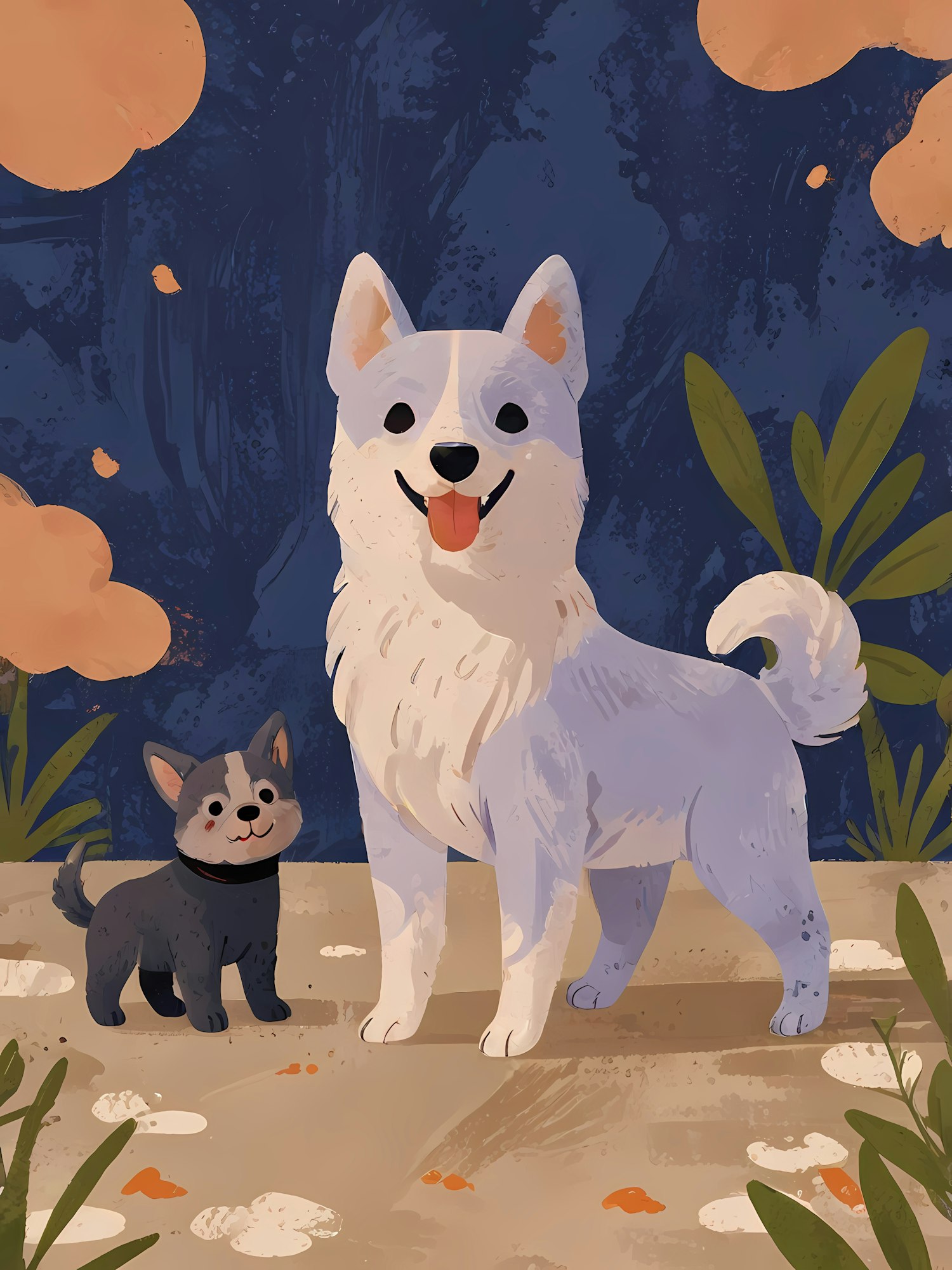 Illustration of two adorable dogs, one white and one gray, against a whimsical blue and orange background.