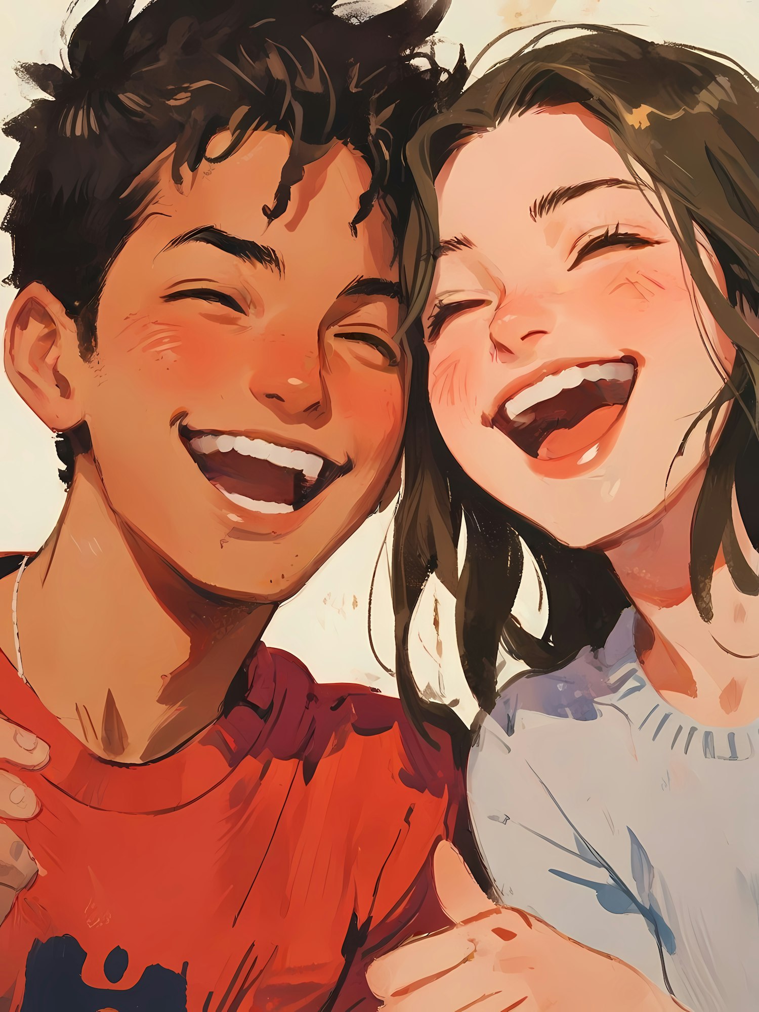 A cheerful illustration of two friends sharing a laugh, one in red and the other in blue, with expressive, warm colors capturing the moment.
