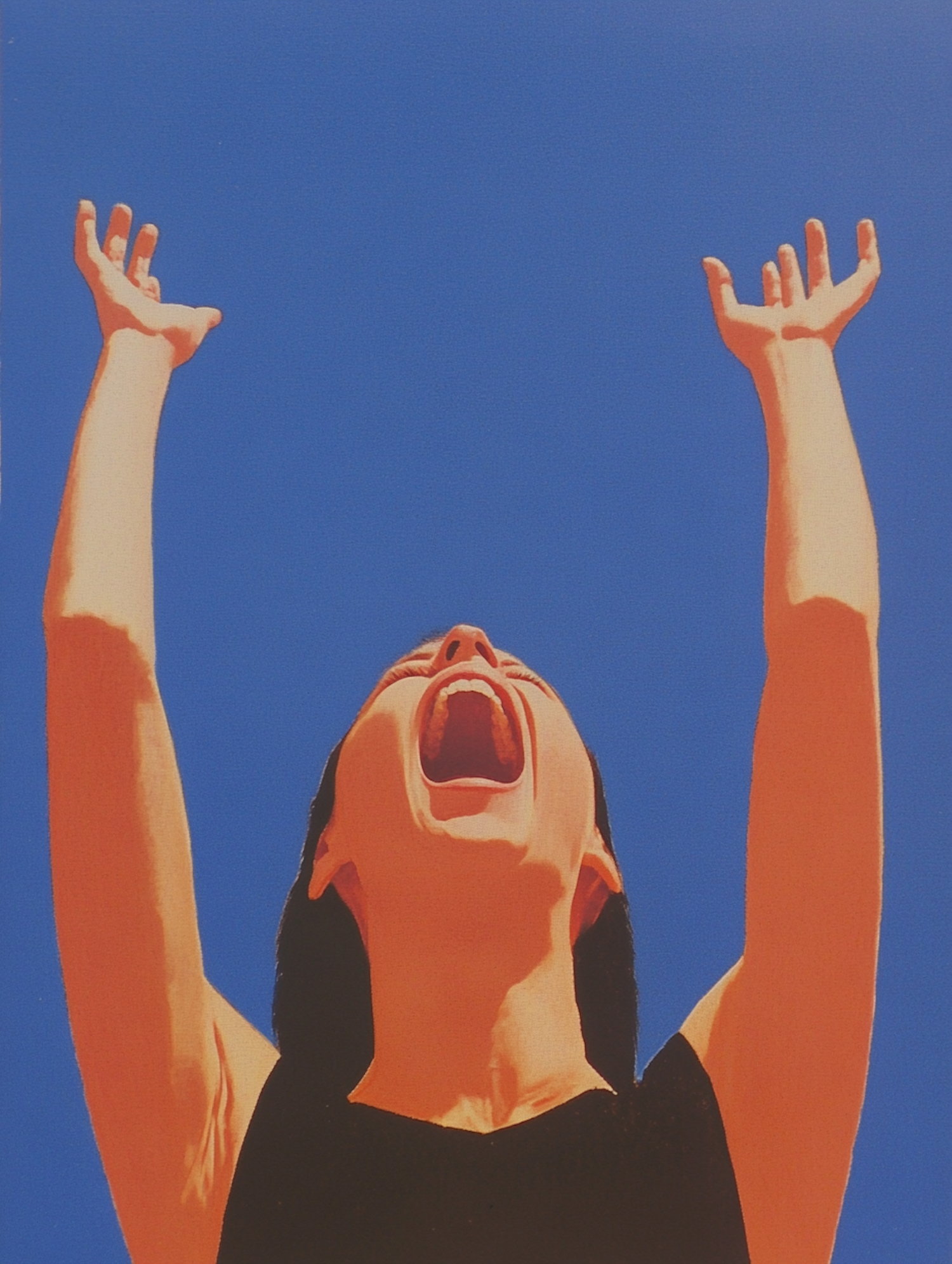 Woman with arms raised against a vivid blue sky, expressing joy or triumph. Striking contrast between skin and sky enhances emotion.