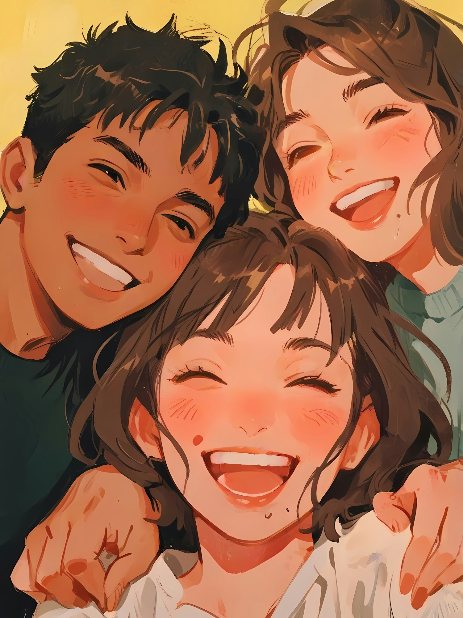 Colorful anime-style illustration of three people laughing and enjoying a joyful moment together. Vibrant hues and detailed character design.