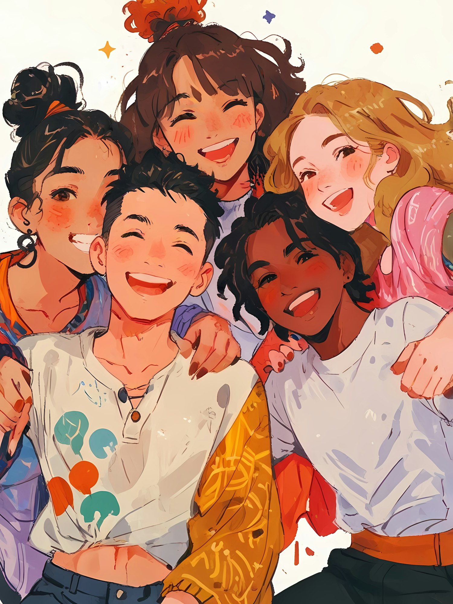 A cheerful illustration of diverse friends enjoying each other's company, capturing their smiles and colorful casual outfits.