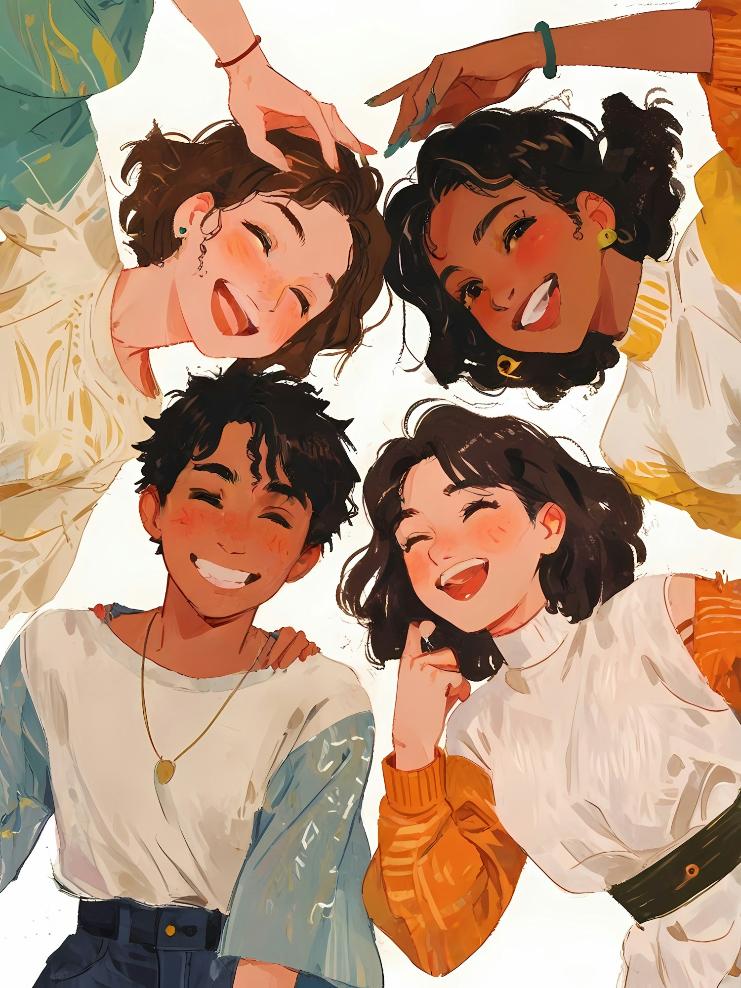 Bright illustration of a diverse group joyfully posing together, showcasing camaraderie with vibrant colors and cheerful expression.