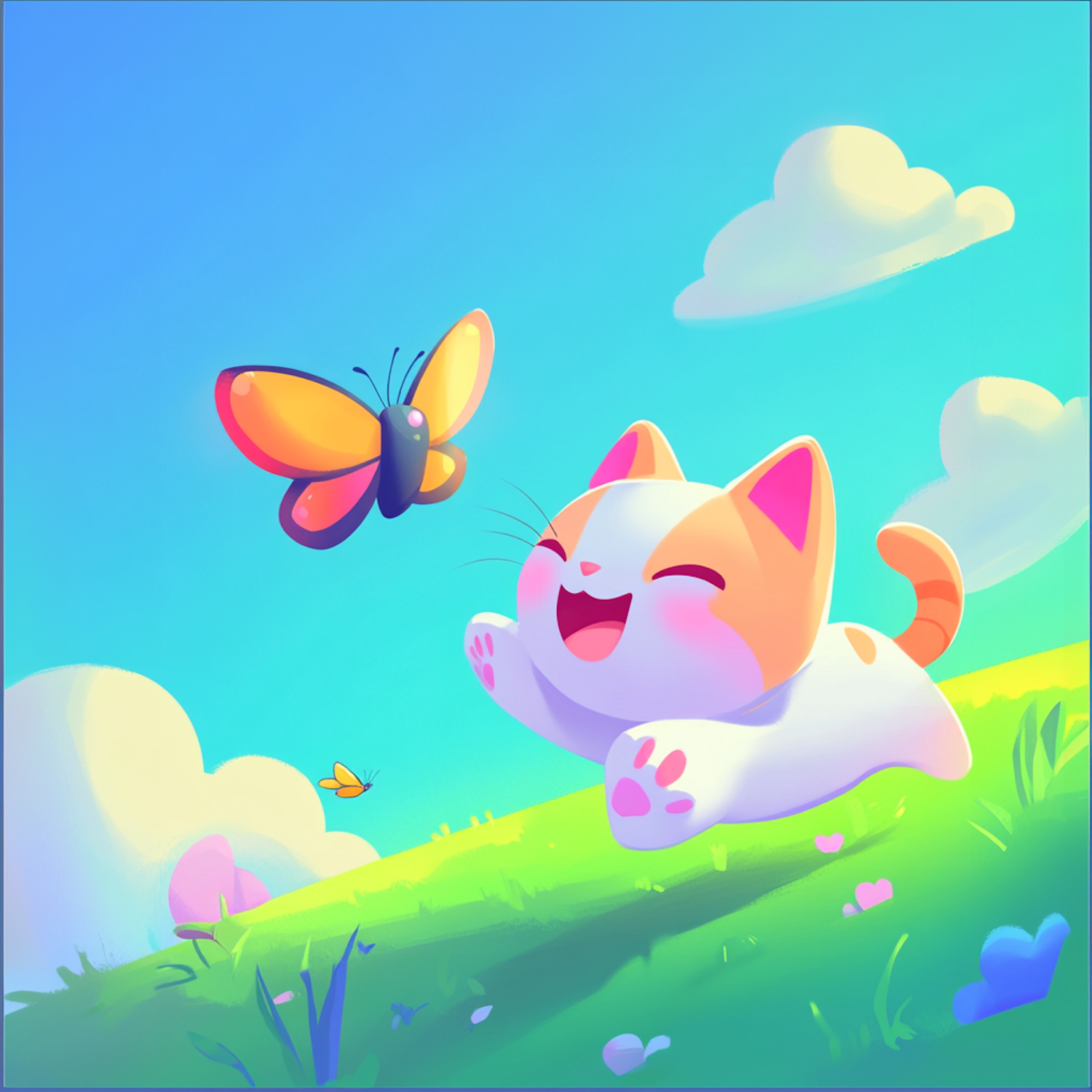 Adorable cartoon cat joyfully chasing a butterfly in a vibrant meadow under a bright blue sky with fluffy clouds.