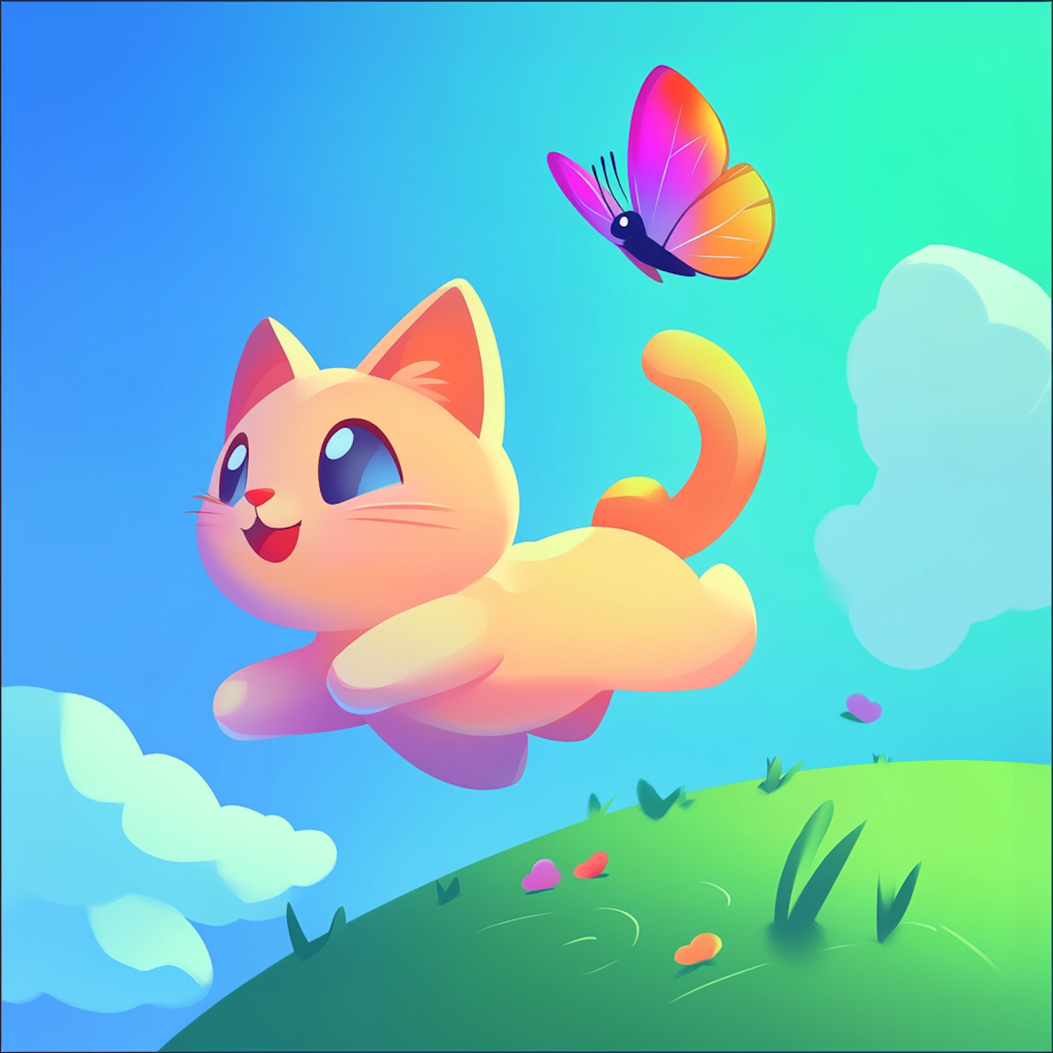 A cute cartoon cat leaps joyfully with a colorful butterfly in a bright, whimsical landscape.
