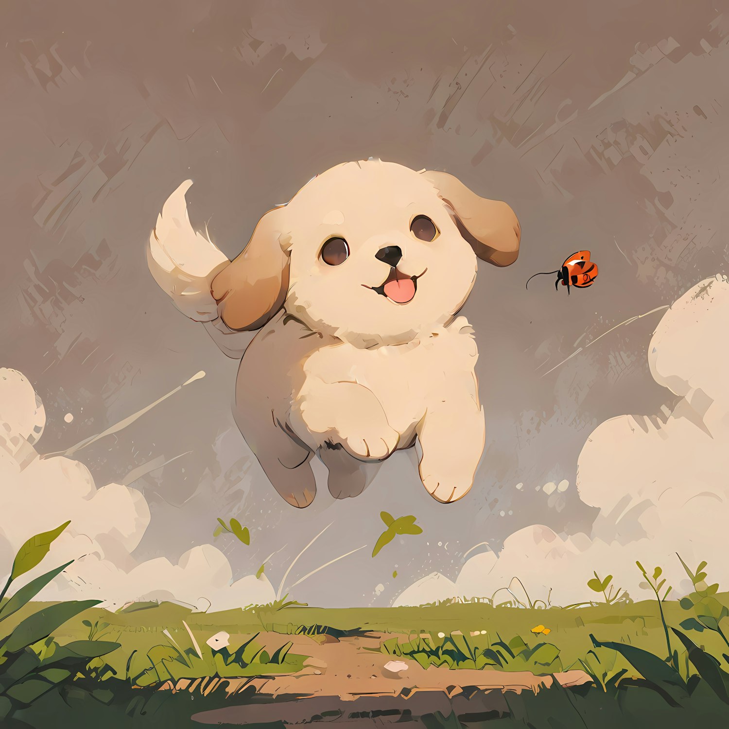 Adorable fluffy puppy leaping joyfully in a grassy field with a ladybug nearby. Soft colors and playful expression create a whimsical scene.