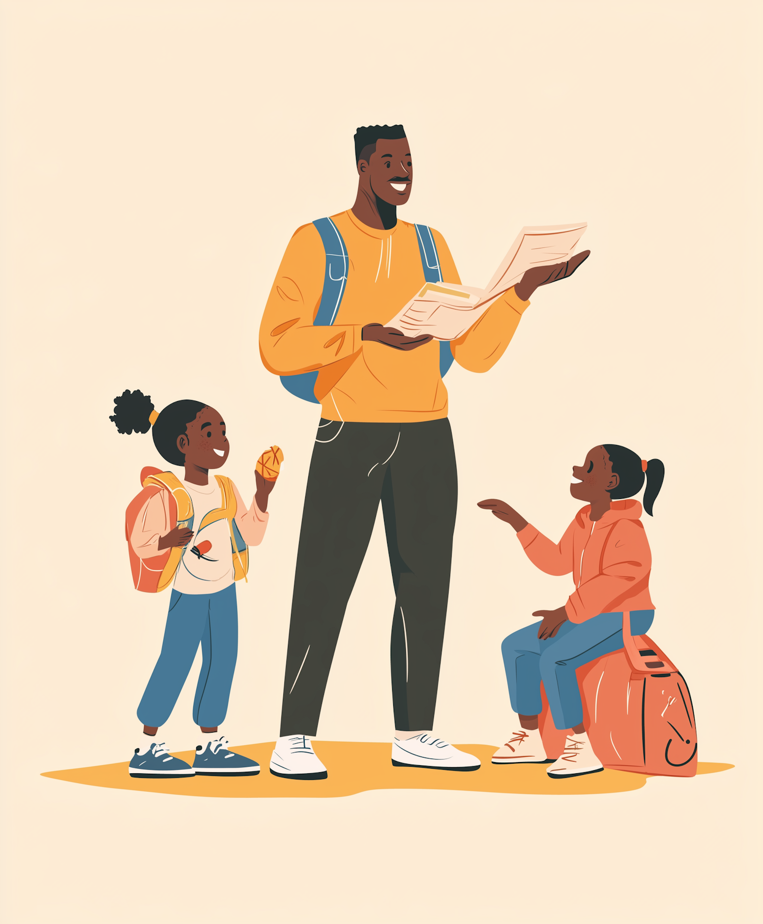 Illustration of a man reading to two children, one standing with a snack, the other sitting on a bag, in a warm, friendly setting.