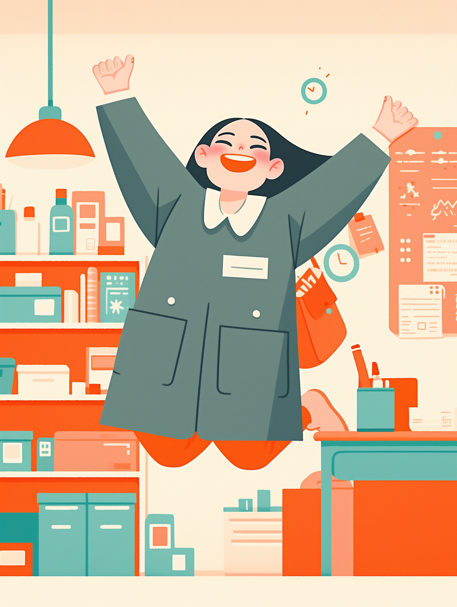 Joyful illustration of a person in a lab coat celebrating in a colorful laboratory setting, filled with vibrant green and orange hues.