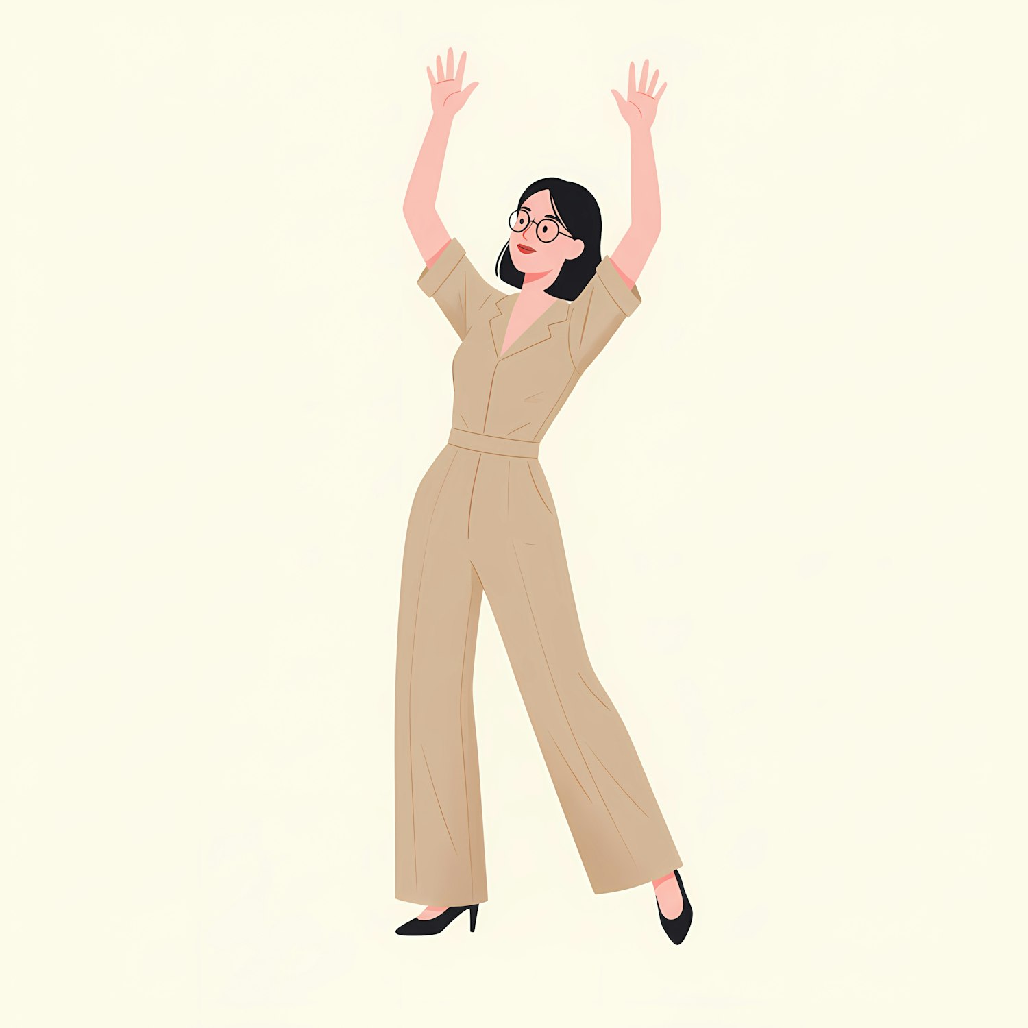 Illustration of a woman in a beige jumpsuit and glasses, raising her arms in a cheerful pose on a light background.