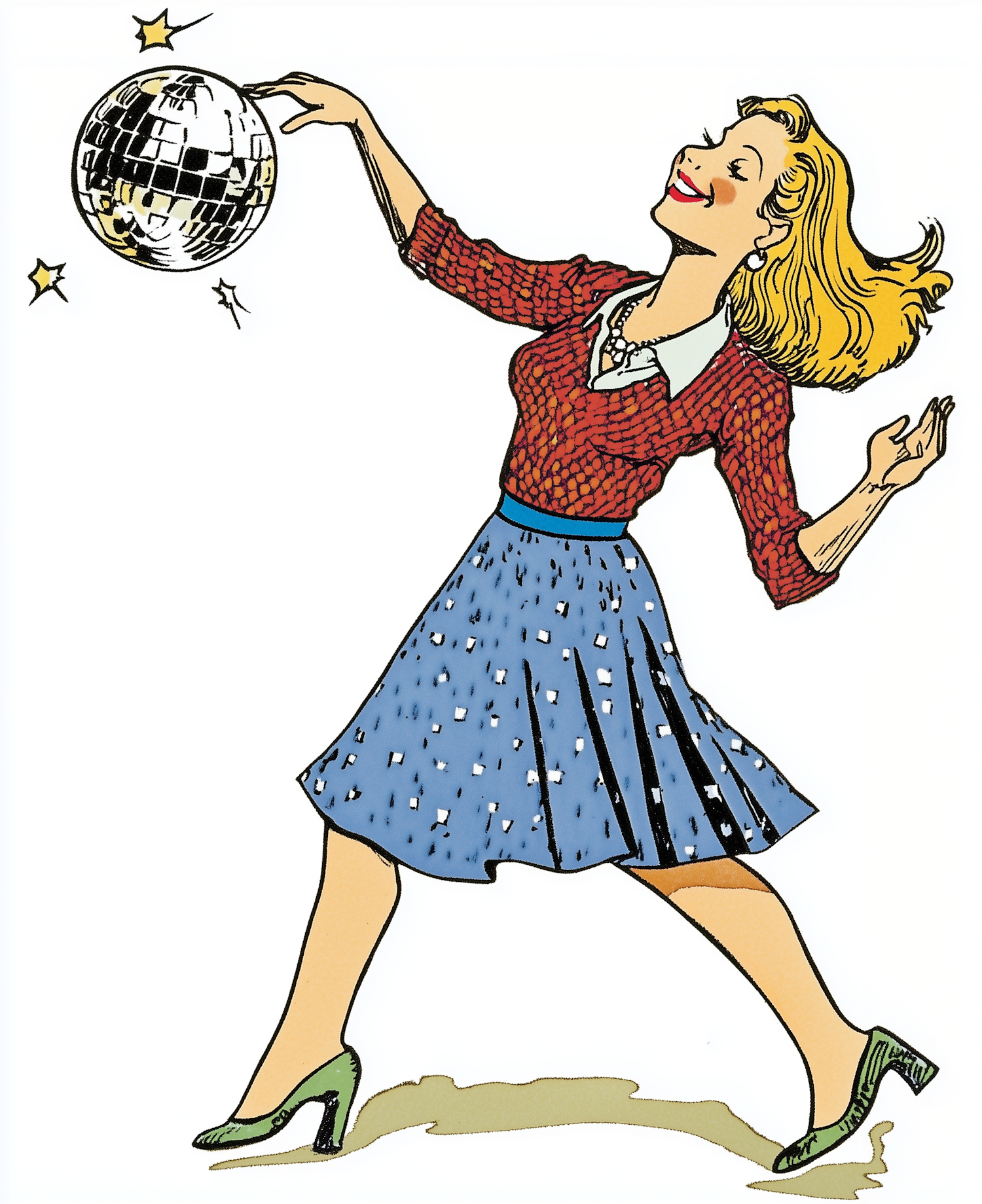 Retro illustration of a joyful woman dancing with a disco ball, wearing a red sweater and blue skirt. Vibrant and whimsical design.