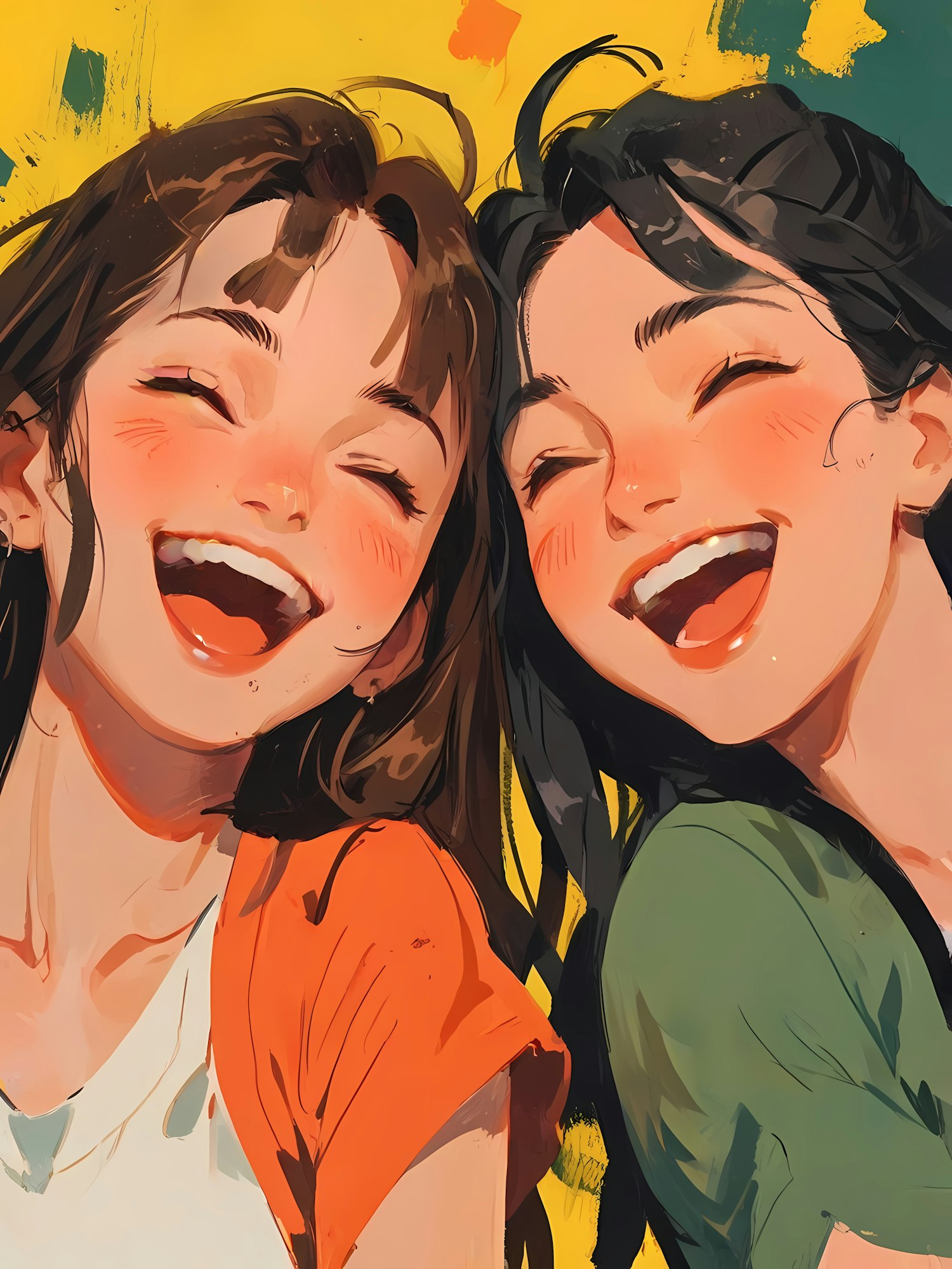 Colorful illustration capturing two friends laughing joyfully against a vivid background, radiating happiness and camaraderie.
