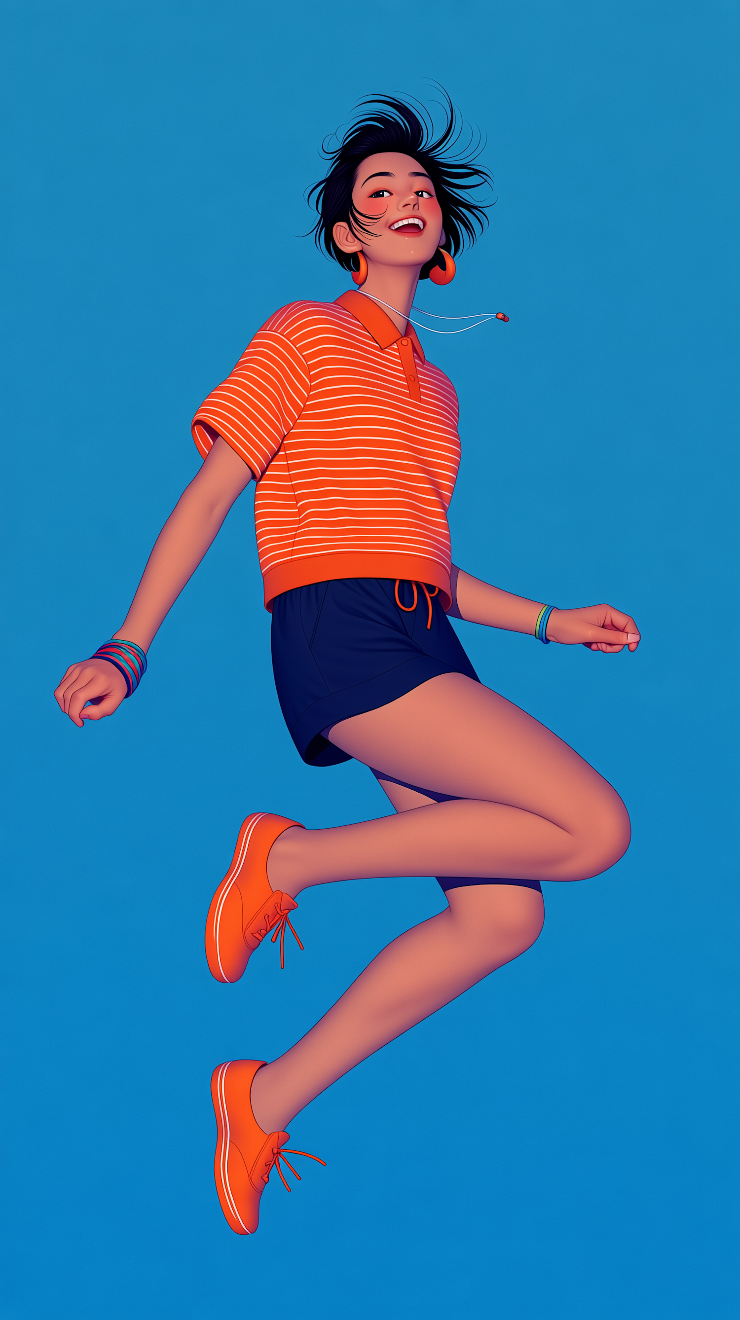 Dynamic illustration of a joyful person jumping, wearing bright orange and navy attire, set against a vivid blue background.