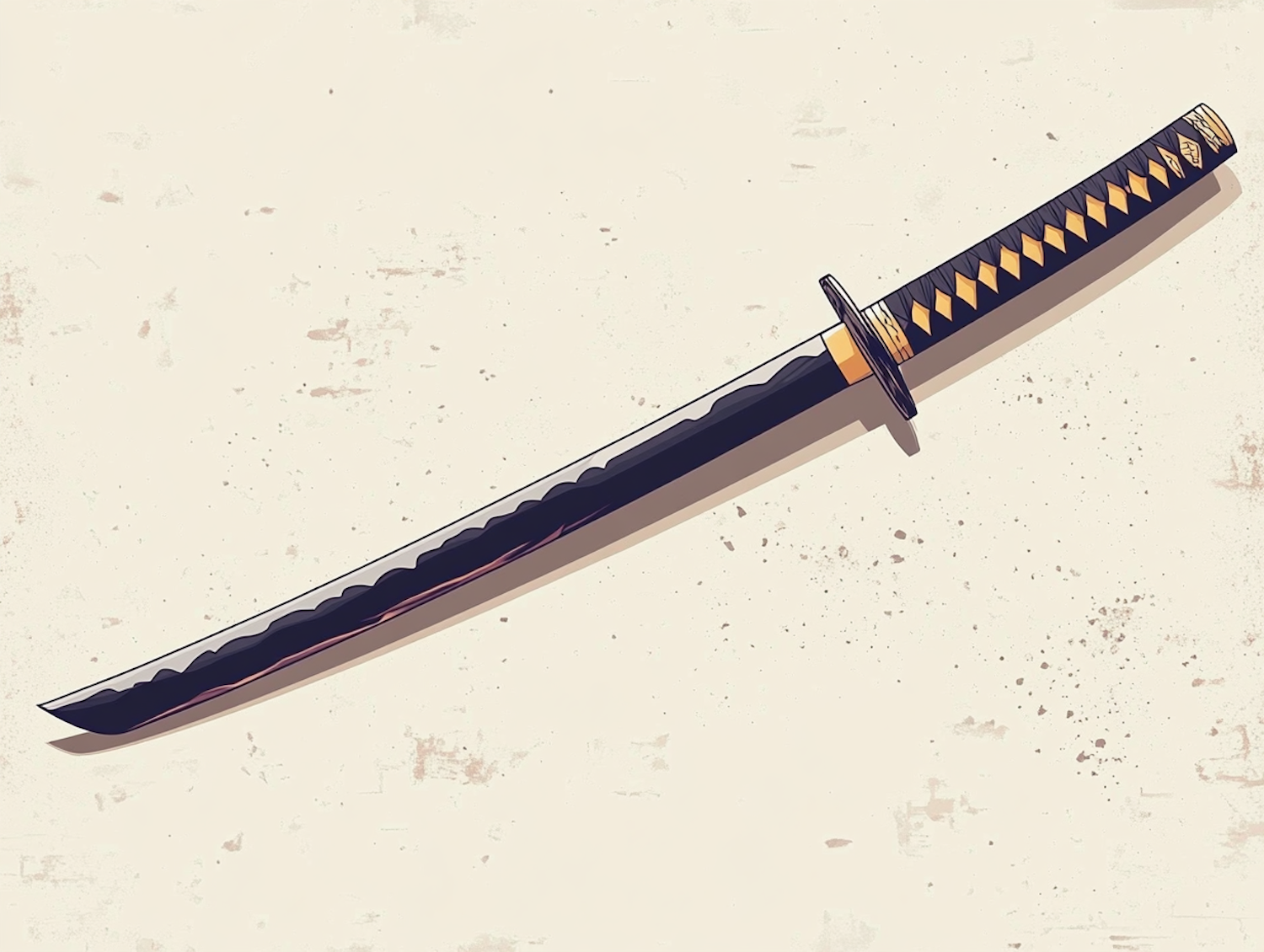 Stylized illustration of a katana sword with a black and gold handle, set against a textured off-white background.